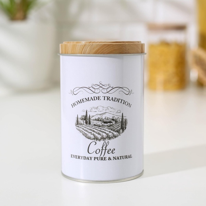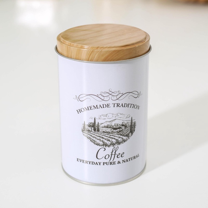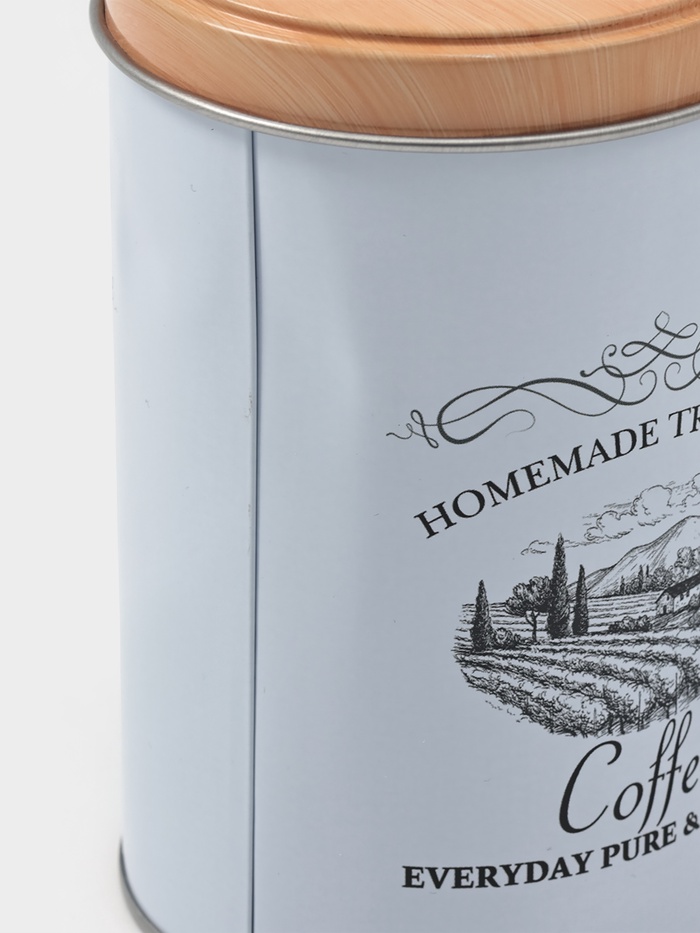 Жестяная банка с рисунком служит надёжным контейнером для кофе и других сыпучих продуктов, сохраняя порядок и добавляя уют на кухне.