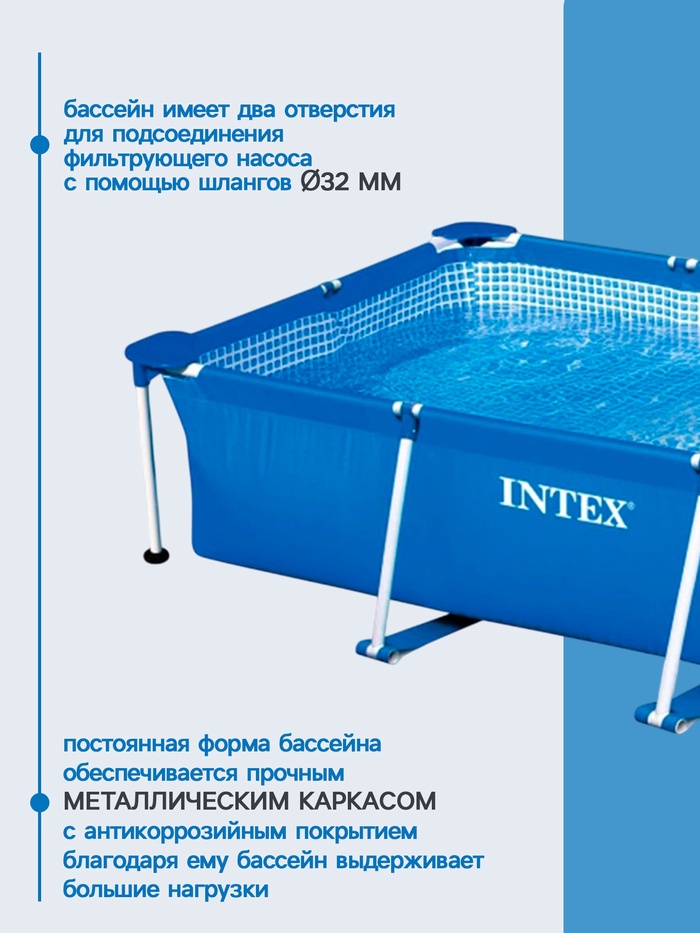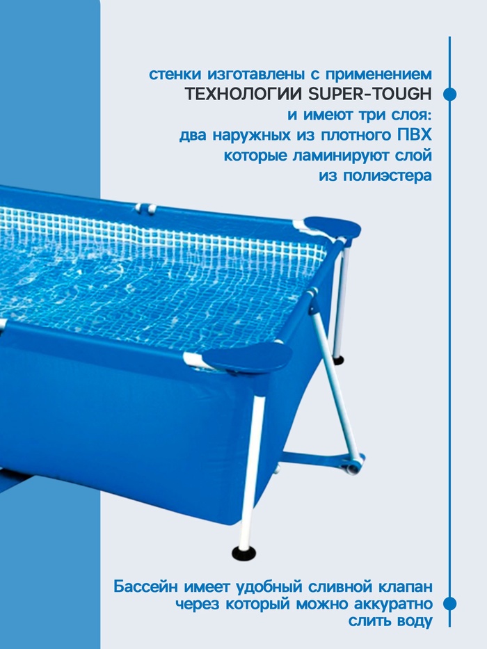 Габариты: 29,8 x 22,5 x 101,6 Артикул поставщика: 28272NP Страна: Китай В боксе: 1 шт Состав: Металл, ПВХ Материалы: металл, ПВХ Фасовка: по 1 шт Индивидуальная упаковка: Цветная коробка Габариты товара: 300 см × 200 см × 75 см Сертификат: Не подлежит сертификации Причина уценки: порвана коробка; помята коробка Цвет: Синий Форма: Прямоугольная Длина, см: 300 Ширина, см: 200 Высота, см: 75 Количество слоёв: 3 Объём, л: 3834 Тент: Нет Подстилка: Нет Лестница: Нет Темпер. ограничение НЕ НИЖЕ ℃: 0 Диспенсер: Нет Наличие фильтр-насоса: Нет Фиксированная цена: Да Каркасный бассейн — это отличный выбор для всей семьи. Его размер также делает его невероятно практичным бассейном. Каркас бассейна сделан из прочного металла, что позволяет выдерживать ему большие нагрузки. Материал бассейна выдерживает суровые погодные условия, устойчив к прямым попаданиям солнечных лучей и воздействию хлора, выдерживает давление больших объёмов воды. Встроенный сливной клапан облегчает слив воды, путём присоединения садового шланга с входящим в комплект адаптером. Таким образом, воду можно слить в любое удобное место или, например, полить сад. Комментарии к товару