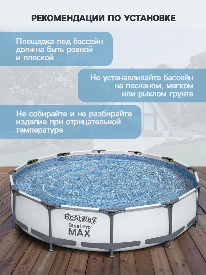 Габариты: 88,5 x 39 x 28,5 Артикул поставщика: 56416 Страна: Китай В боксе: 1 шт Состав: Металл, ПВХ, пластик Материалы: металл, ПВХ, пластик Фасовка: по 1 шт Индивидуальная упаковка: Картонная коробка / упаковка Габариты товара: 366 см × 76 см Сертификат: Не подлежит сертификации Причина уценки: помята коробка; потёртости на коробке Цвет: Серый Форма: Круглая Диаметр, см: 366 Высота, см: 76 Тип фильтра для насоса: Фильтр-картридж Количество слоёв: 3 Вес нетто, кг: 21,71 Производительность, л/ч: 1249 Объём, л: 6473 Тент: Нет Подстилка: Нет Лестница: Нет Темпер. ограничение НЕ НИЖЕ ℃: 0 Диспенсер: Нет Наличие фильтр-насоса: Да Фиксированная цена: Да Бассейн быстро устанавливается благодаря простой системе сборки труб. Никаких дополнительных инструментов не требуется. Металлическая трубчатая конструкция удерживает давление воды в бассейне, сохраняя его устойчивость и стабильность во время использования. Бассейн необходимо установить на ровную поверхность, удалив предметы, которые могут повредить дно. Благодаря материалу Duraplus™ лайнер устойчив к проколам. Два слоя 3-слойного армированного ПВХ с полиэстеровой сеткой в центре повышают долговечность, устойчивость к ультрафиолетовым лучам. Высокая прочность материала и соединение швов выдерживают большие нагрузки. Технология Framelink System™ обеспечивает противокоррозионное действие между соединениями. Это уменьшает образование ржавчины. В комплекте к бассейну входит: фильтр-насос с картриджем. Конструкция