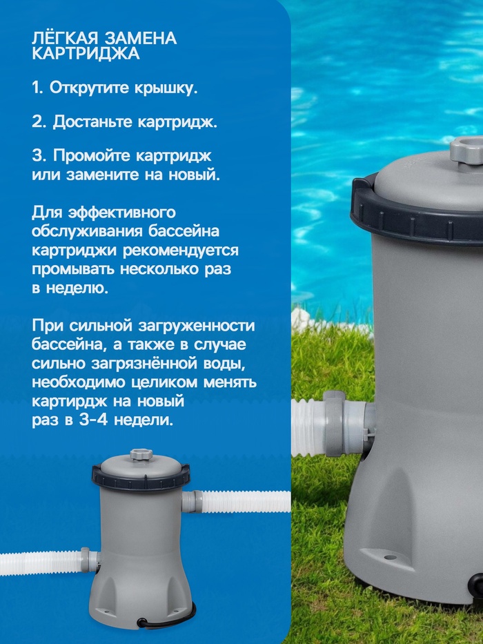 Габариты: 27 x 27 x 32 Артикул поставщика: 58383 Страна: Китай В боксе: 4 шт Состав: Пластик Материалы: пластик Фасовка: по 1 шт Индивидуальная упаковка: Цветная коробка Сертификат: ЕАС Причина уценки: помята коробка; порвана коробка Тип: Фильтр-насос Тип фильтра для насоса: Фильтр-картридж Вес нетто, кг: 1,96 Производительность, л/ч: 2006 Мощность, л/час: 2006 Темпер. ограничение НЕ НИЖЕ ℃: 0 Фиксированная цена: Да Насос предназначен для фильтрации воды в бассейне не реже одного раза в 8 часов. В комплект насоса входят два шланга, которые крепятся к двум отдельным точкам бассейна. Свободный конец одного шланга подсоединяется к фильтрующему насосу. Вода выкачивается из бассейна через шланг, затем обеззараживается фильтрующим картриджем и подаётся обратно через другой шланг. Затем процесс начинается заново, обеспечивая чистую и прозрачную. Для эффективной работы фильтра-насоса рекомендуется менять или промывать картриджи раз в месяц, при непрерывной работе — 1 раз в 2 недели. Характеристики