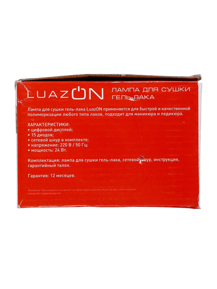 Производитель: Luazon Home Габариты: 21,5 x 13 x 9 Страна: Китай В боксе: 20 шт Фасовка: по 1 шт Индивидуальная упаковка: Цветная картонная коробка Габариты товара: 21 см × 12 см × 8 см Сертификат: ЕАС Причина уценки: нарушена упаковка Тип питания: От сети 220 В Количество ламп: 15 Набор: Нет Цвет: Розовый, Белый Мощность, Вт: 24 Гарантийный срок, мес.: 12 Датчик движения: Нет Педаль: Нет Съёмное дно: Нет Вид: Лампа для гель-лака Таймер: Нет Дисплей: Да Регулировка мощности: Нет Тип управления: Механическое Тип лампы: LED Технология двойного источника света: Нет Внутренняя поверхность лампы: Матовая Режим низкого нагрева: Нет Комплектация: Маникюрная лампа, Сетевой шнур, Руководство по эксплуатации Назначение: Маникюр, Педикюр Фиксированная цена: Да