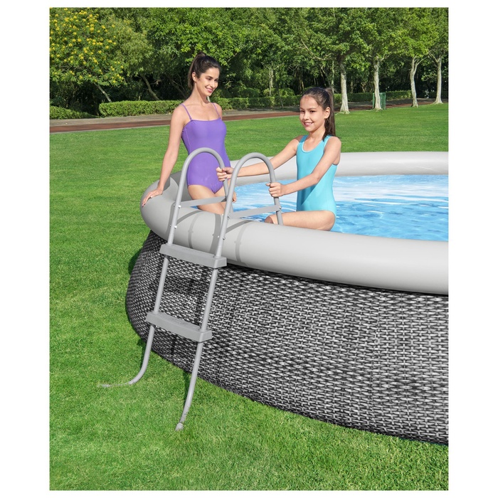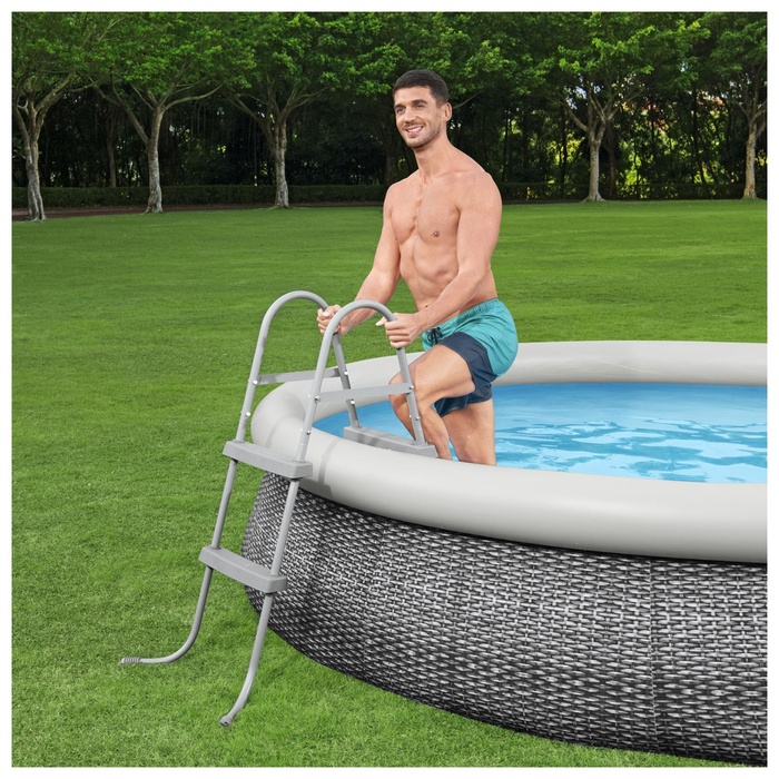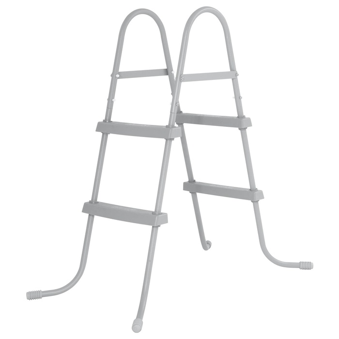 Лестница устанавливается по обе стороны бассейна. Каркас изготовлен из нержавеющего металлического сплава, ступени сделаны из прочного пластика. Выберите подходящее место для входа в бассейн и поставьте лестницу там, где вам удобно.