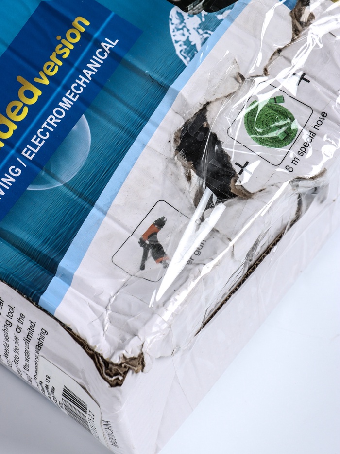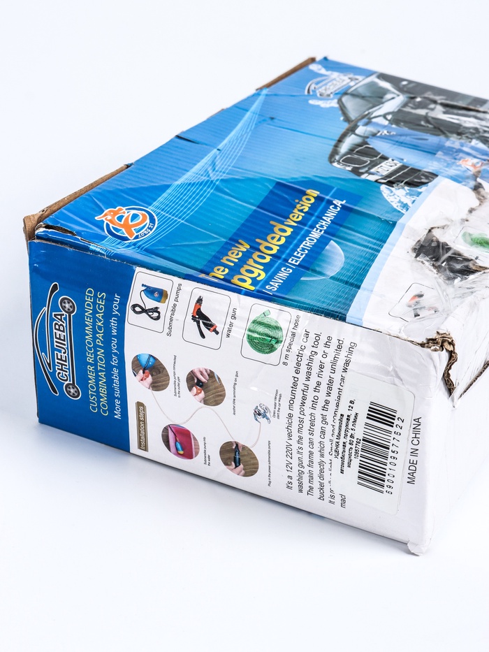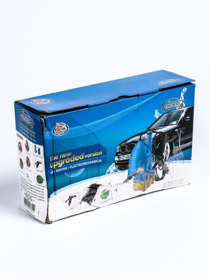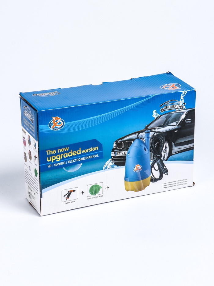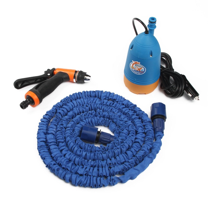 Конструкция предусматривает насос с возможностью погружения в ёмкость с водой (например, ведро) и шланг с насадкой-распылителем для очистки кузова. Устройство рассчитано на мощность 80 Вт и обеспечивает производительность до 5 л/мин, что позволяет проводить базовую мойку без использования промышленного оборудования. Габариты компактны — 43×9,5×28 см, вес 1,3 кг — благодаря этому мойку удобно хранить в багажнике и использовать в дороге или на даче.