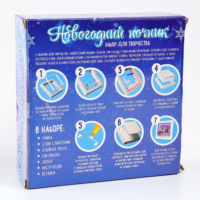 Габариты: 19 x 19 x 5,5 Страна: Китай В боксе: 42 набор Состав: Пластик Материалы: пластик Фасовка: по 1 набор Индивидуальная упаковка: Цветная картонная коробка Сертификат: Не подлежит сертификации Причина уценки: нарушена упаковка Форма: Квадратная Возраст: От 7 лет Символ года: Нет Тематика праздника: Новый год Материал: Пластик Для создания: Ночники Составляющие набора: Товары для творчества Фиксированная цена: Да С таким набором для творчества ребёнок своими руками сделает уникальный ночник, который будет его радовать перед сном. Сборка ночника с картинкой внутри поможет развить творческие способности ребёнка. А ещё подарит радость и новогоднее настроение всей семье. Создайте волшебную атмосферу праздника! Как сделать ночник