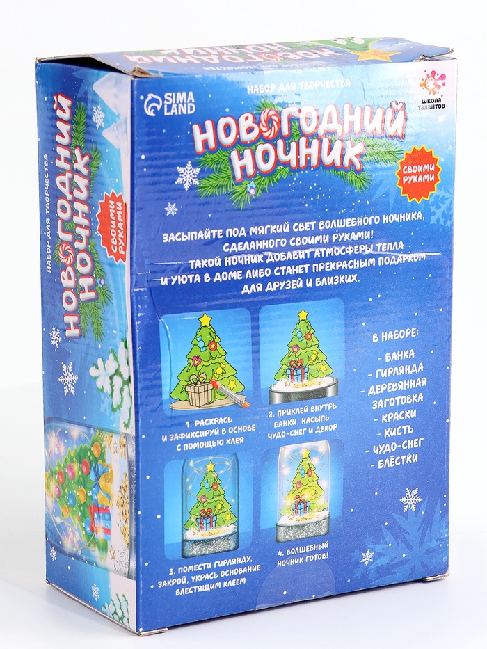 В наборе: купол, гирлянда, деревянная заготовка, краски, кисть, чудо-снег, блёстки. Рекомендовано для детей от 4 лет. Комментарии к товару
