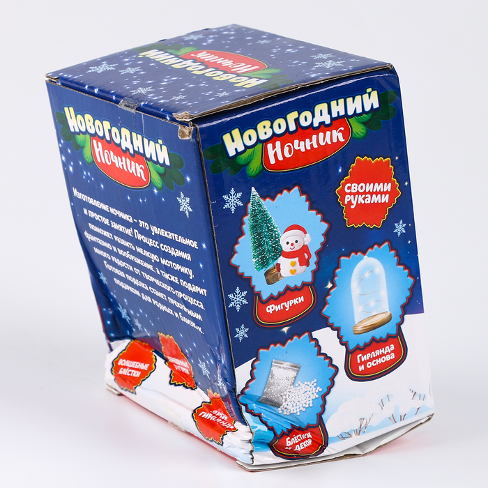 В наборе: деревянная основа-подставка, прозрачный купол, 2 фигурки, клей, блёстки, искусственный снег, светящаяся гирлянда.
