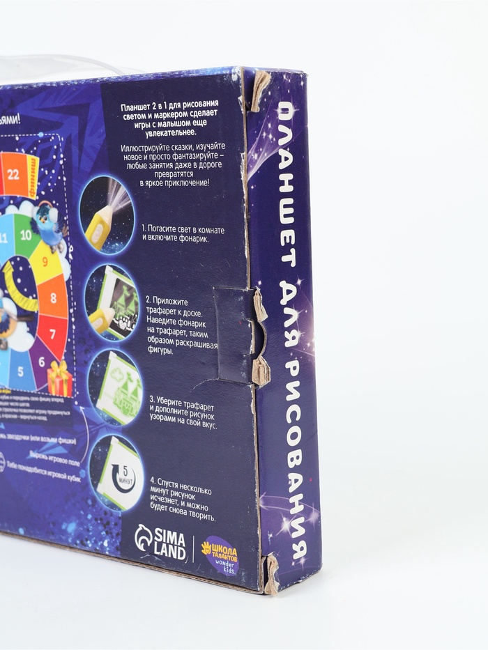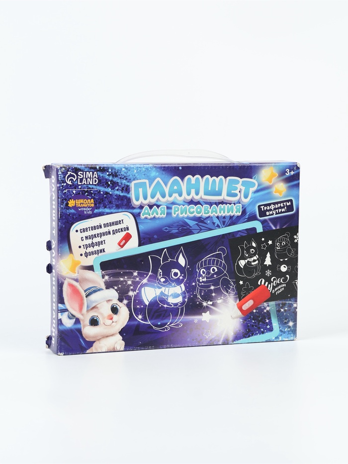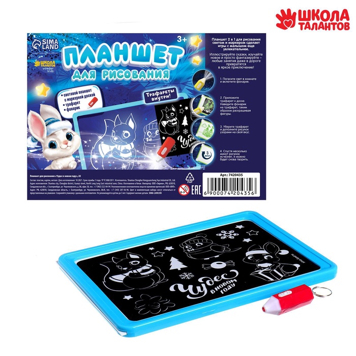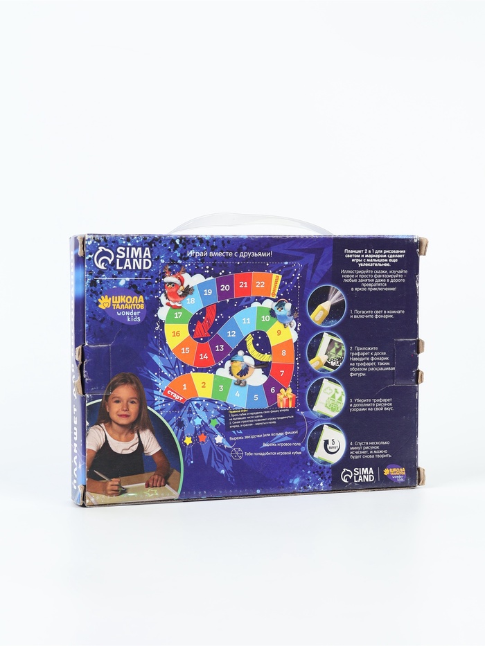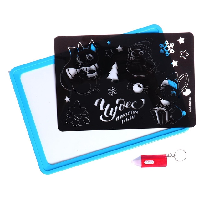 Габариты: 22 x 16 x 3 Страна: Китай В боксе: 50 шт Состав: Металл, пластик Материалы: металл, пластик Фасовка: по 1 шт Индивидуальная упаковка: Пакет Габариты товара: 30 см × 21 см × 2 см Сертификат: ЕАС Причина уценки: нарушена упаковка Для кого: Унисекс Возраст: От 3 лет Символ года: Нет Тематика праздника: Новый год Типоразмер батареек: LR41 (AG3, LR736, SR41) Для создания: Игрушки Составляющие набора: Игрушка Назначение: Для рисования светом, Для рисования маркером, мелками Тематика набора: Роспись, раскраска, рисование, Трафареты Фиксированная цена: Да Добавим творчеству новогоднего волшебства! Планшет 2 в 1 для рисования светом и маркером сделает игры незабываемыми. Иллюстрируйте сказки, изучайте новое и фантазируйте - любые занятия, даже в дороге, превратятся в яркое приключение! Погасите свет в комнате и включите фонарик. Приложите трафарет к доске и наведите фонарик на рисунок, таким образом раскрашивая фигуры. Чем ближе вы держите маркер к планшету, тем ярче будет изображение. Если линии стали тусклыми, замените батарейки в маркере. В комплекте три элемента питания типа AGW 1.5 V. Уберите трафарет и дополните рисунок узорами на свой вкус. Спустя несколько минут рисунок исчезнет, и можно будет снова творить! Встречаем Новый год вместе! Комплектация