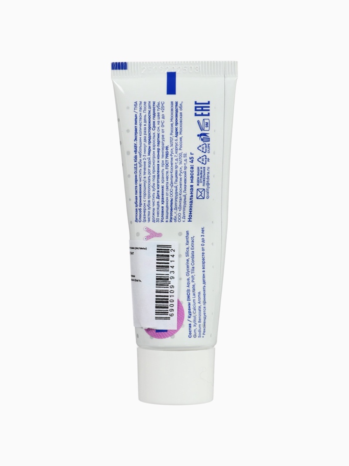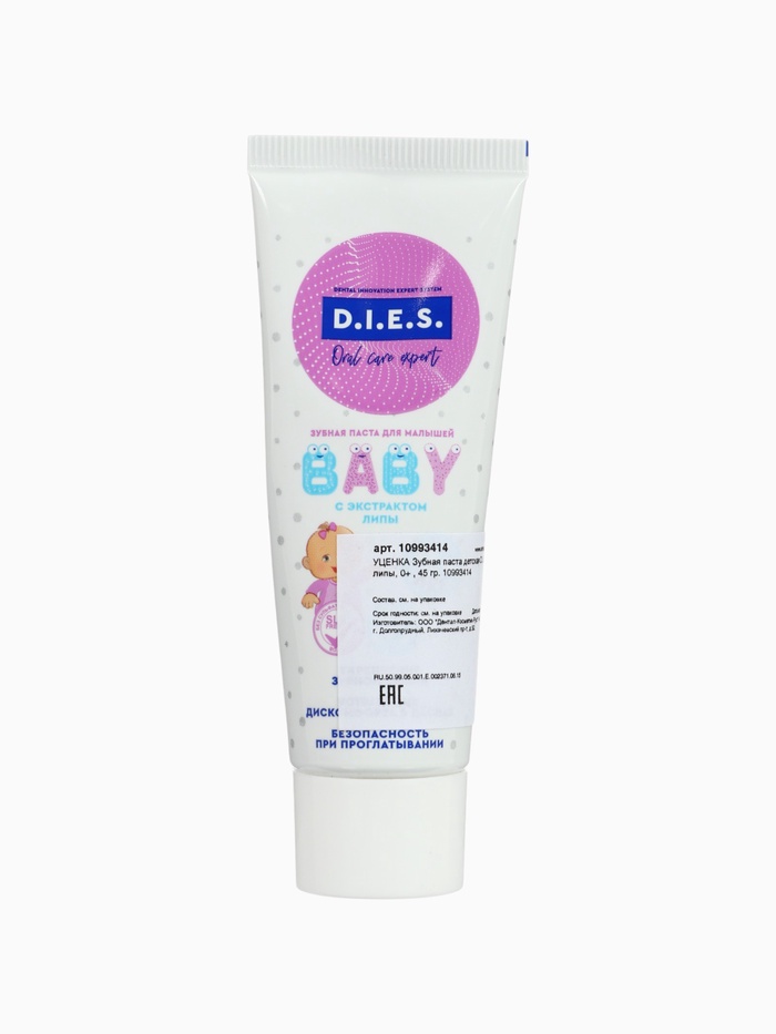 Габариты: 4 x 3,5 x 13,5 Страна: Россия В боксе: 24 шт Состав: См. на упаковке Материалы: см. на упаковке Фасовка: по 1 шт Индивидуальная упаковка: Без упаковки Сертификат: ЕАС Причина уценки: Отсутствие упаковки Возраст: От 0 месяцев Вес, г/Объём, мл: 45 Возраст: Детям от 0 до 3 лет Назначение: Для зубов и дёсен Темпер. ограничение НЕ НИЖЕ ℃: 0 С дозатором: Нет Применение: Защита от кариеса Вес/Объём: 45 г Специальная формула зубной пасты D.I.E.S. Kids Baby с экстрактом липы разработана с учетом особенностей первых детских зубов. Активный кальций помогает формированию крепкой эмали. Специальный комплекс с ксилитом снижает риск развития кариеса. Экстракт липы способствует снижению зуда и раздражения при прорезывании зубов. Экологичная основа пасты делает её безопасной при проглатывании.Обладает приятным вкусом липы. Подходит для детей от 0+ лет. Стоматологи рекомендуют чистить зубы не менее 2 раз в день в течение 3–5 минут. Комментарии к товару