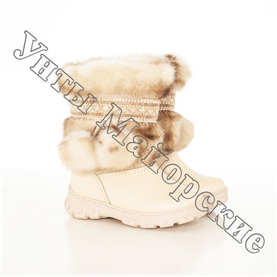Теплые детские унты в бежевом цвете. Материал верха – мех “тигр”, стелька и подкладка из теплой шерсти. Детали: наружная сторона голенища выполнена из пушистого искусственного меха, внутри натуральная овчина(между ними утеплитель), литая подошва, логотип бренда, союзка-натуральная кожа.