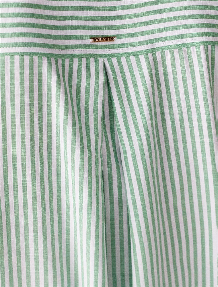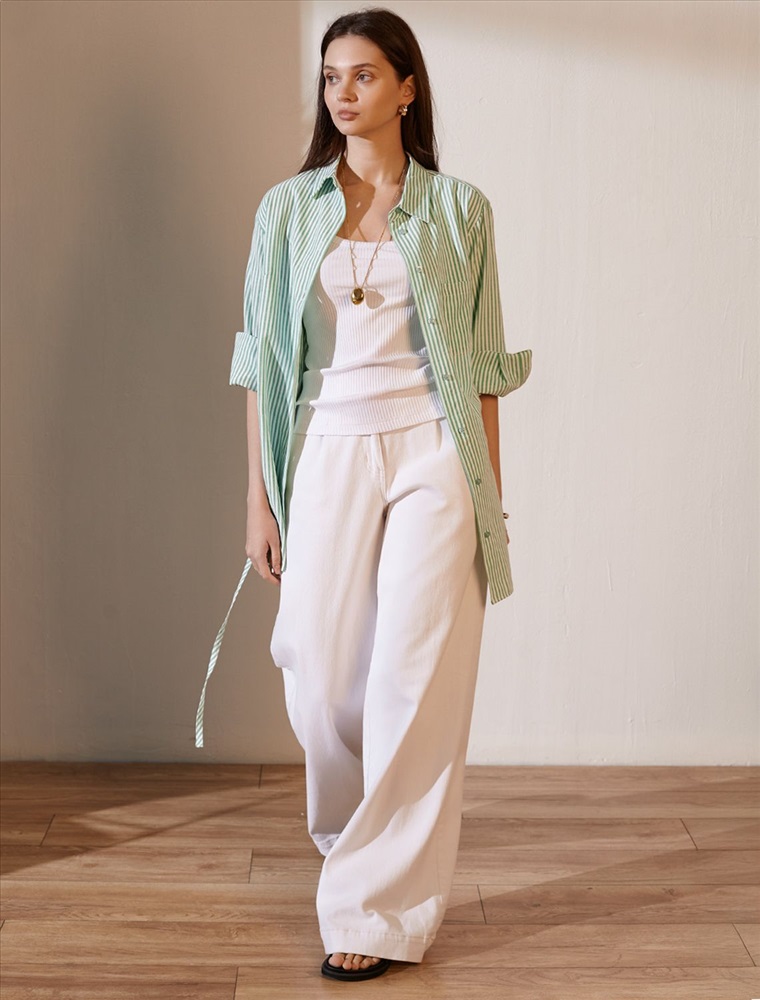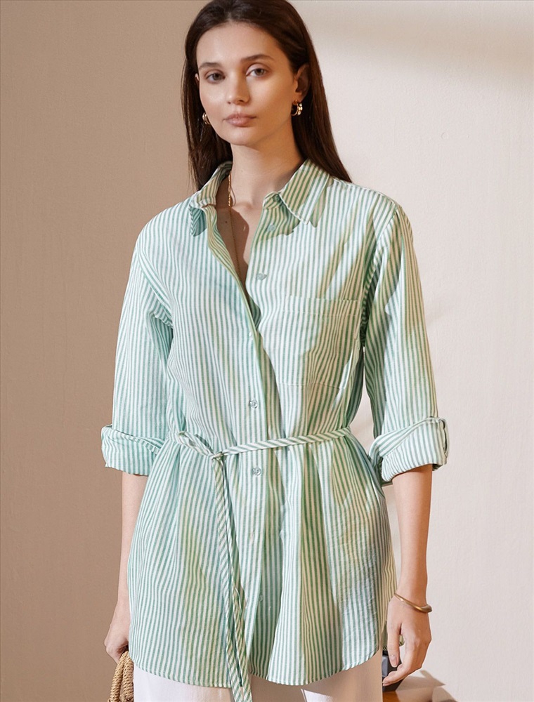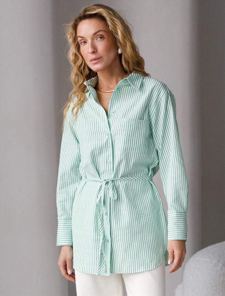 Женственная удлиненная блузка белого цвета в тонкую фисташковую полоску прекрасно освежает повседневный образ благодаря нежной расцветке. Натуральный хлопок обеспечивает деликатное прилегание, хорошую воздухопроницаемость, не сковывает движений и подходит для долгого ношения. Благодаря поясу классическую рубашку можно приталить, создавая красивый силуэт, где выгодно подчеркнутся достоинства фигуры и добавится изящества образу. Удлиненный крой рубашки поможет скрыть возможные недостаки фигуры, при этом выглядеть стильно. Отложной воротник и манжеты придают блузке аккуратный и завершенный вид. Принт в тонкую полоску добавляет динамику и легкость, такая блузка остается актуальной вне зависимости от сезона. Повседневная длинная блузка легко комбинируется с различными низами и поможет создать расслабленный или элегантный образ в зависимости от выбранных аксессуаров.