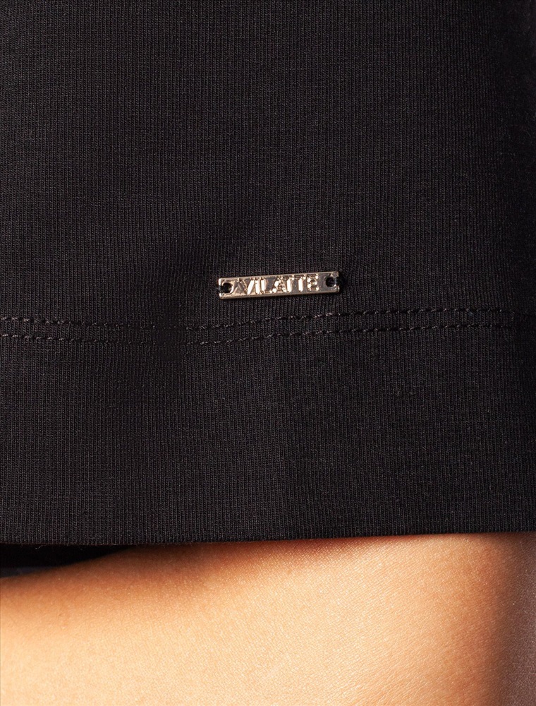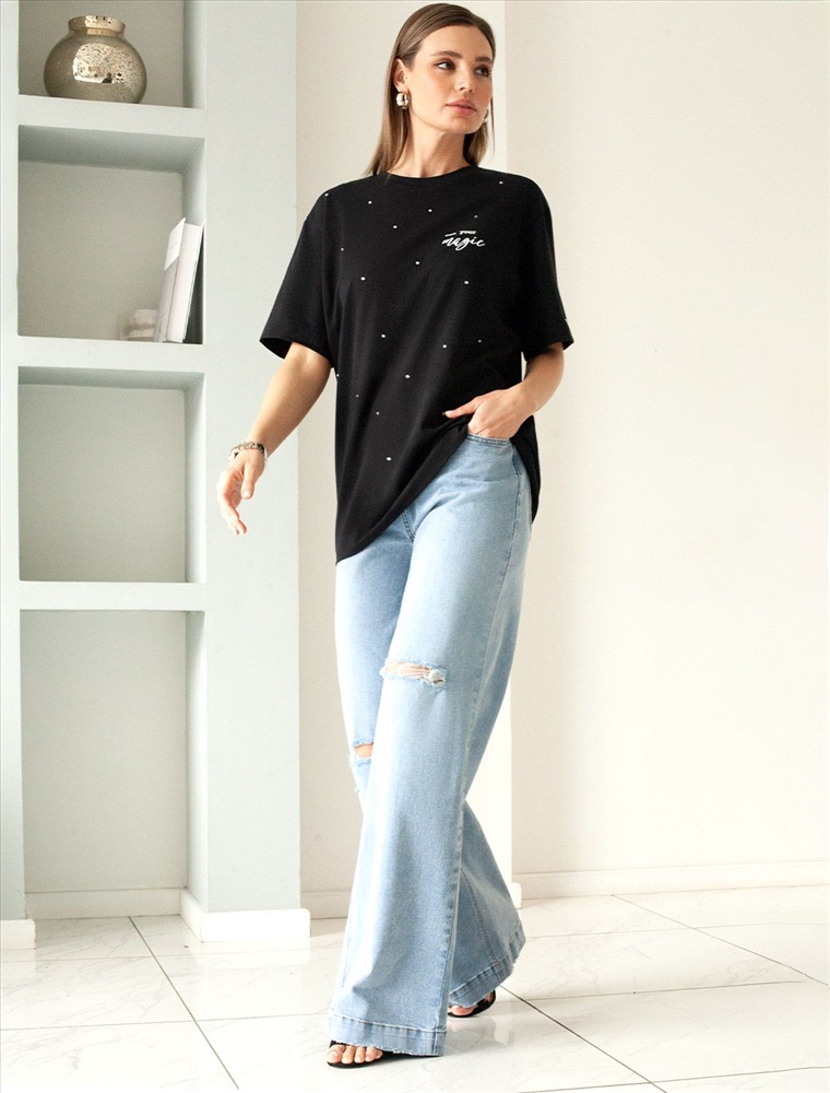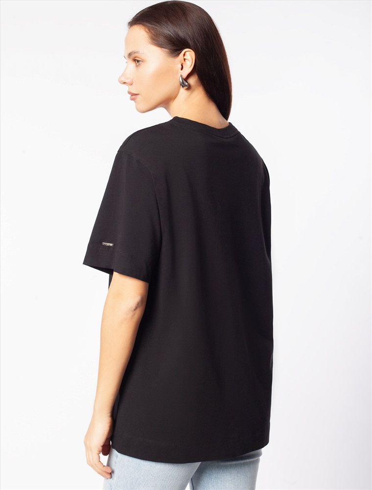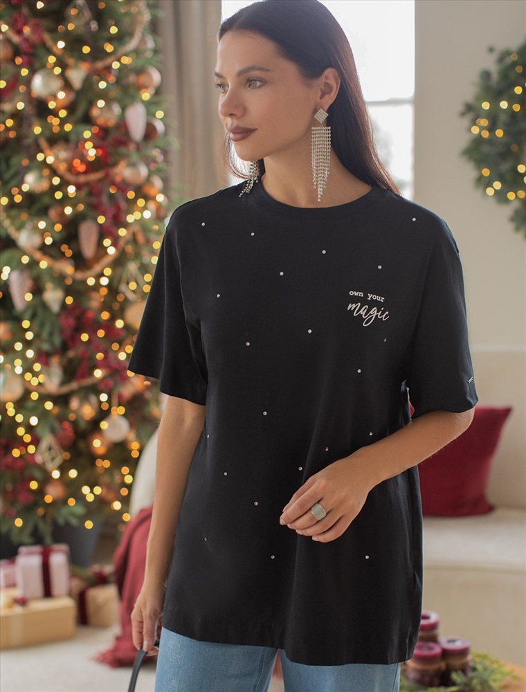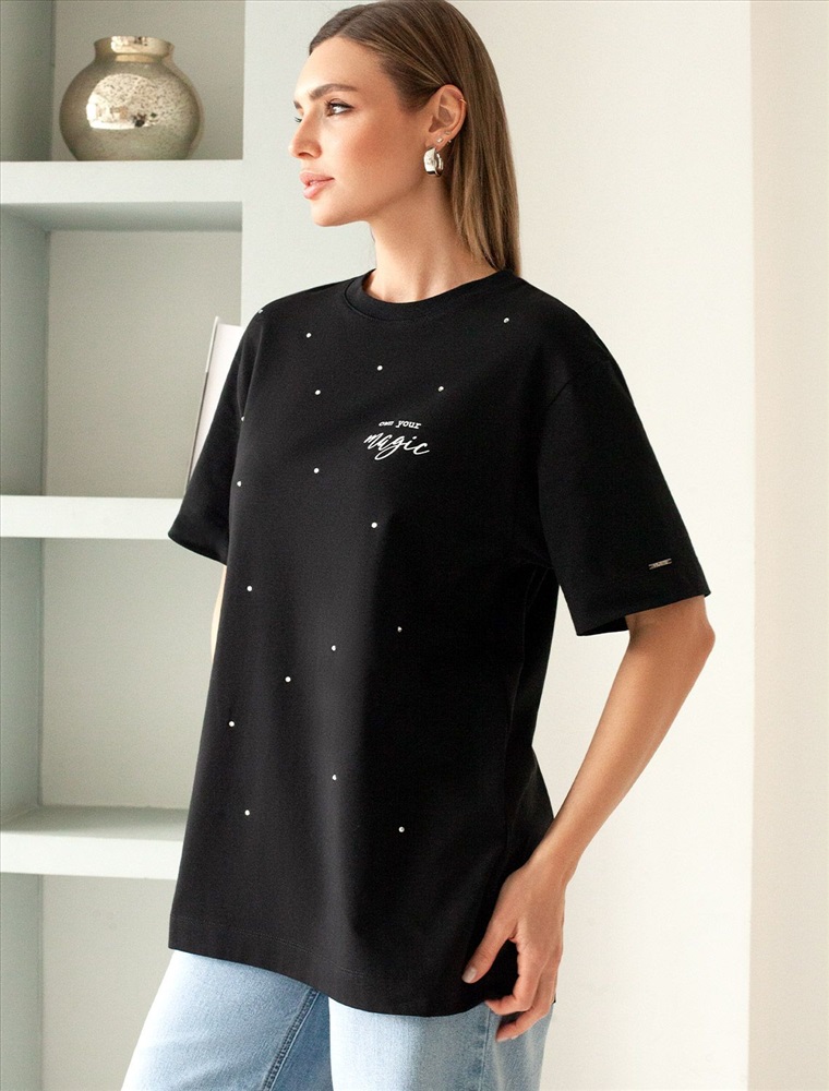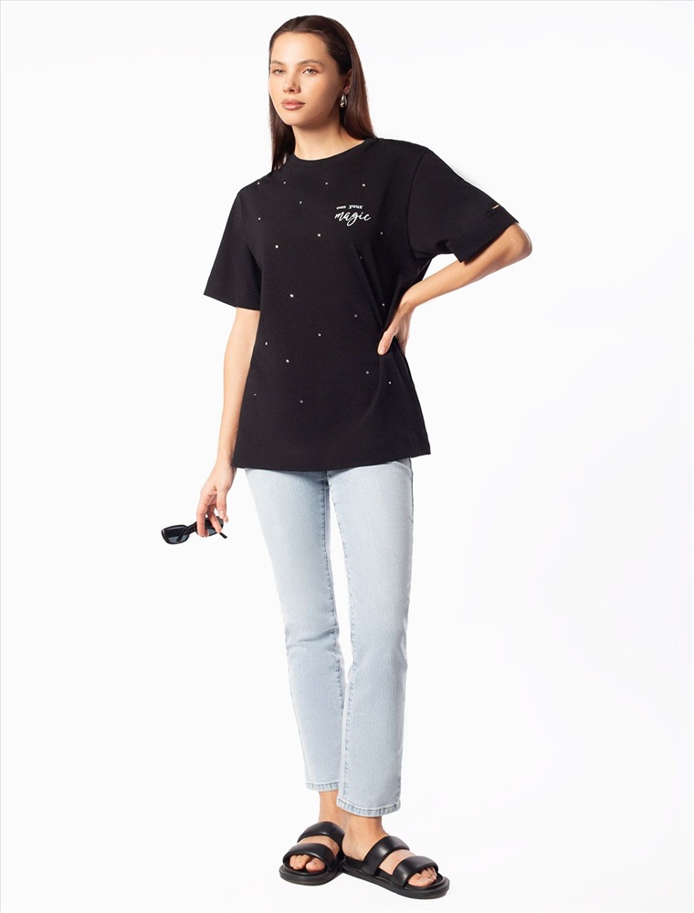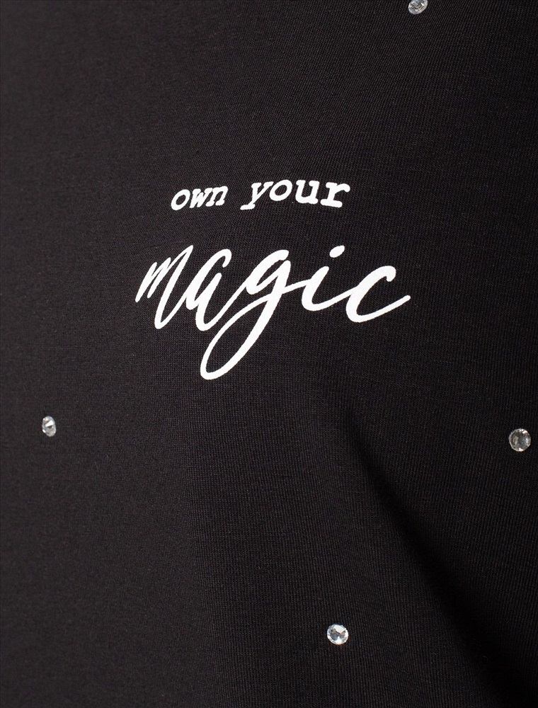 Состав: 92%Хлопок 8%ПУ; Плотность: 170 Г/м2; Параметры модели на первом фото: Рост 170, бюст 89, талия 63, бедра 92 Футболка свободного кроя выполнена из премиального хлопка. Лаконичный принт нанесен красками с устойчивым покрытием и россыпью сияющих страз. Перевод: «Own your magic - Твори свою магию» Наличие эластана в составе гарантирует абсолютный комфорт и долговечность изделия. Модель дополнена металлическим логотипом бренда.