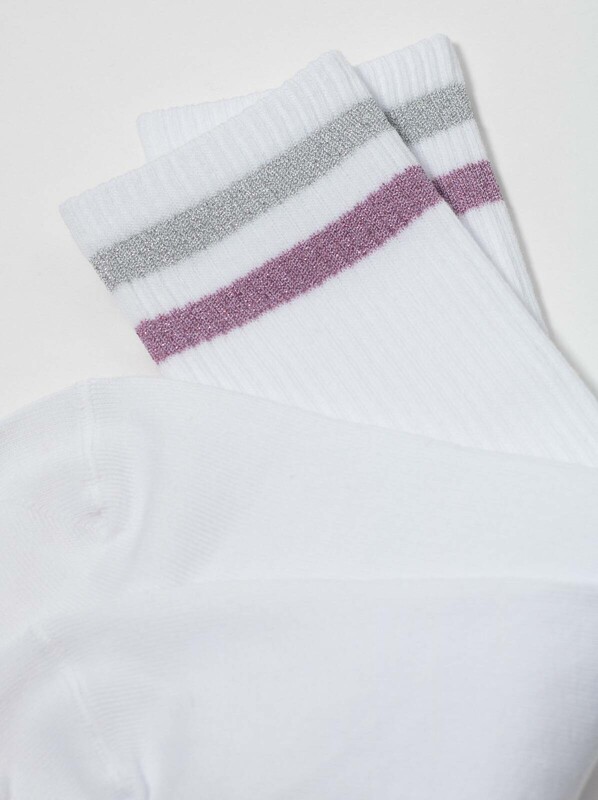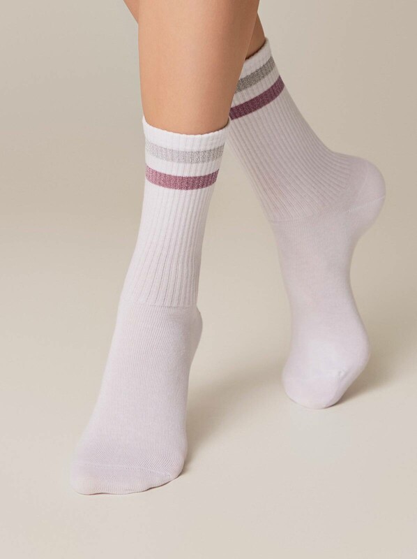 Хлопковые носки с яркими полосками из люрекса смотрятся так стильно и оригинально, что вам не захочется прятать их под одеждой. Смело носите трендовые носочки ACTIVE в стиле спорт-шик и с удовольствием подчеркивайте свою индивидуальность.