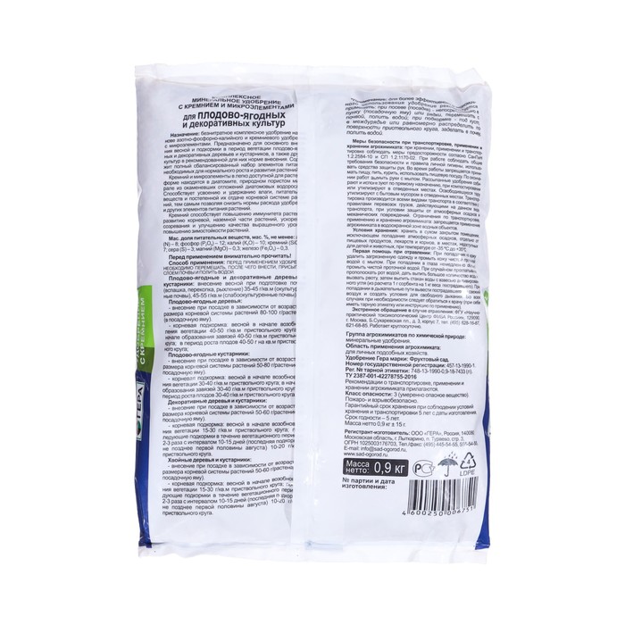Габариты: 20 x 15 x 3 Доставка: Платная Страна: Россия В боксе: 25 шт Состав: См. на упаковке Материалы: см. на упаковке Фасовка: по 1 шт Индивидуальная упаковка: Пакет Сертификат: СТР Происхождение: Минеральные (неорганические) Препаративная форма: Порошок Вид: Удобрения Периоды применения: Весна, Осень, Лето Комплексные удобрения: Нет Класс опасности: 3 класс (умеренно опасные) Группы элементов: Макроудобрения Эффект: Увеличение урожая Комплексное минеральное удобрение (тукосмесь) на основе азотно-фосфорно-калийного удобрения и диатомита. Предназначено для основного внесения и подкормки в период вегетации плодово-ягодных и декоративных деревьев и кустарников, а также других культур в рекомендованной для них норме внесения. Содержит полный сбалансированный набор элементов питания, необходимых для нормального роста и развития растений и получения урожая высокого качества. Диатомит — природный пористый минерал из окаменевших отложений диатомовых водорослей. Наличие в диатомите кремния в аморфной форме, легко растворимой для питания растений, способствует усвоению и удержанию влаги, питательных веществ и постепенной их отдаче корневой системе растений, тем самым позволяя снизить нормы расхода NPK и других элементов питания растений. Удобрение способствует ускорению созревания и улучшению качества плодов и ягод, увеличению содержания сахаров и витаминов, а также повышает сопротивляемость растений к внешним неблагоприятным факторам (болезням, насекомым-вредителям, засухе, заморозкам и т.д.). Увеличивает количество закладываемых на следующий год плодовых почек, повышает зимостойкость растений. Комментарии к товару