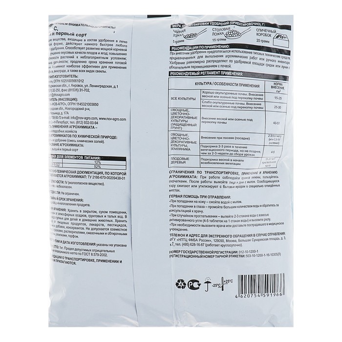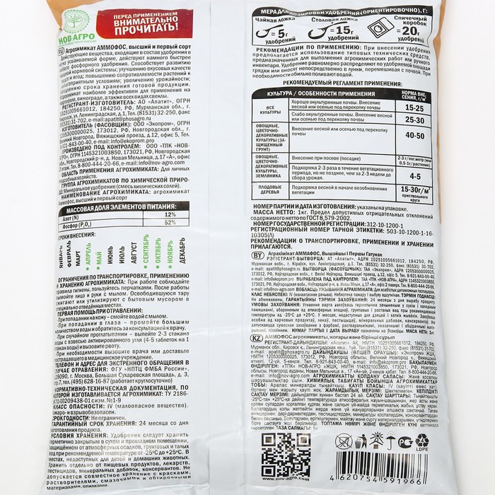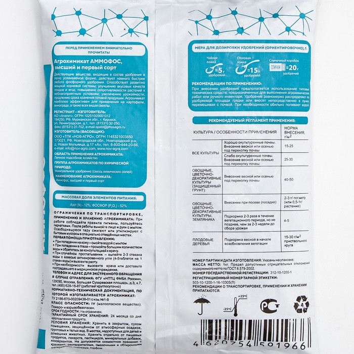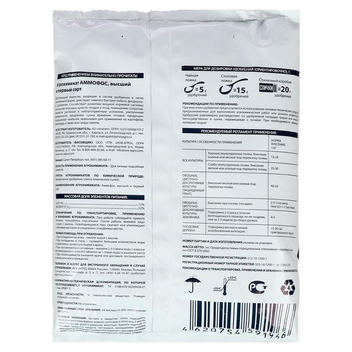 Габариты: 23 x 17 x 3 Доставка: Платная Страна: Россия В боксе: 30 шт Состав: См. на упаковке Материалы: см. на упаковке Фасовка: по 1 шт Индивидуальная упаковка: Пакет Габариты товара: 16 см × 3 см × 21 см Сертификат: СТР Вид средства: Удобрение Область применения: Универсальные Происхождение: Минеральные (неорганические) Препаративная форма: Сухая смесь Вид: Удобрения Периоды применения: Осень, Весна Комплексные удобрения: Нет Класс опасности: 3 класс (умеренно опасные) Группы элементов: Макроудобрения Эффект: Увеличение урожая Вес/Объём: 1 кг Аммофос – моноаммонийфосфат (NH4H2PO4) – это сложное удобрение, получаемое в результате реакции нейтрализации фосфорных кислот аммиаком. В его состав входят 42-52 % фосфора и 10-12% аммонийного азота. Фосфор содержится в водорастворимой форме. Таким образом, аммофос – это водорастворимое безнитратное удобрение с достаточно большой концентрацией действующих элементов, удобрение для растений, которое подойдет для любых грунтов и растительных культур, вне зависимости от того, открытый это будет грунт, или защищенный (теплицы). На основе этого комплексного удобрения готовят различные марки смешанных удобрений (тукосмеси). Аммофос не содержит тяжелых металлов. Производится аммофос из апатитового сырья, которое насыщает грунт полезными веществами, металлами и микроэлементами, играющими важнейшие роли в процессе обмена веществ растений: магний, кремний, цинк, железо и др. Это удобрение увеличивает урожаи, обеспечивает наилучшее развитие сельскохозяйственных культур, способствует устойчивости растений перед неблагоприятным климатом и рядом заболеваний. Урожай, полученный с использованием аммофоса, содержит меньше нитратов и хранится дольше обычного. Комментарии к товару