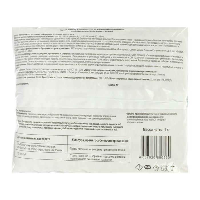 Габариты: 22,5 x 18 x 6 Страна: Россия В боксе: 20 шт Состав: См. на упаковке Материалы: см. на упаковке Фасовка: по 1 шт Индивидуальная упаковка: Без упаковки Сертификат: РСТ Область применения: Для газонов Происхождение: Минеральные (неорганические) Препаративная форма: Гранулы Вид: Удобрения Периоды применения: Круглогодичные Комплексные удобрения: Нет Класс опасности: 3 класс (умеренно опасные) Группы элементов: Макроудобрения Эффект: Увеличение урожая Вес/Объём: 1 кг Удобрение "Пермагробизнес" представляет собой минеральное удобрение, специально разработанное для использования на газоне. Его основное предназначение - обеспечить активный и здоровый рост зеленой части растений, что в свою очередь способствует формированию густого и красивого газонного покрытия.Основным преимуществом удобрения "Пермагробизнес" является его высокое содержание азота, что способствует активному росту зеленой массы растений. Массовая доля азота в удобрении составляет 26,5%, что делает его идеальным выбором для обеспечения растений необходимыми питательными веществами.Кроме того, удобрение "Пермагробизнес" содержит 13% фосфора и 13% калия, что также важно для обеспечения полноценного роста и развития растений. Фосфор способствует формированию корневой системы растений, а калий улучшает их устойчивость к стрессовым условиям и болезням.Применение удобрения "Пермагробизнес" на газоне позволяет обеспечить растения необходимыми питательными веществами, что способствует их здоровому и активному росту. Регулярное применение удобрения позволит вырастить густой и здоровый газон, который будет радовать своим видом на протяжении всего сезона.Начните применять удобрение "Пермагробизнес" уже сегодня и вырастите богатый урожай зеленой массы на своем газоне! Комментарии к товару