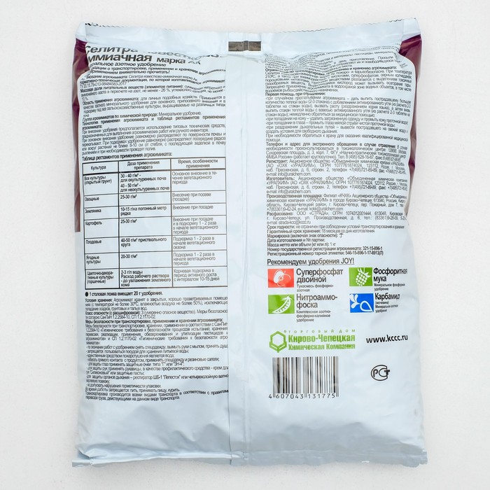 По сравнению с аммиачной селитрой имеет лучшие физико-химические свойства и менее гигроскопично.