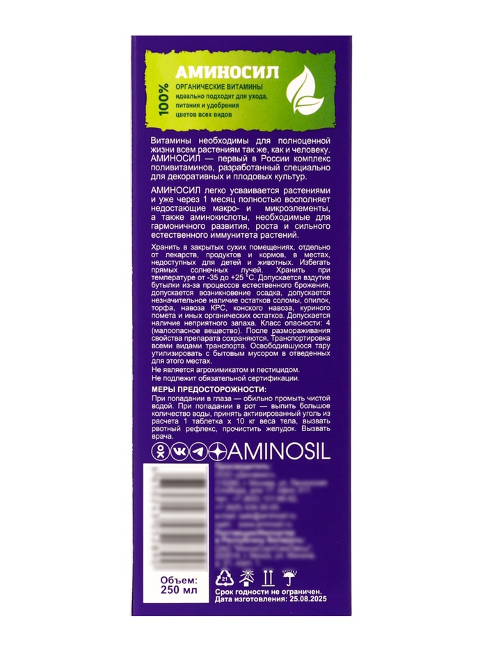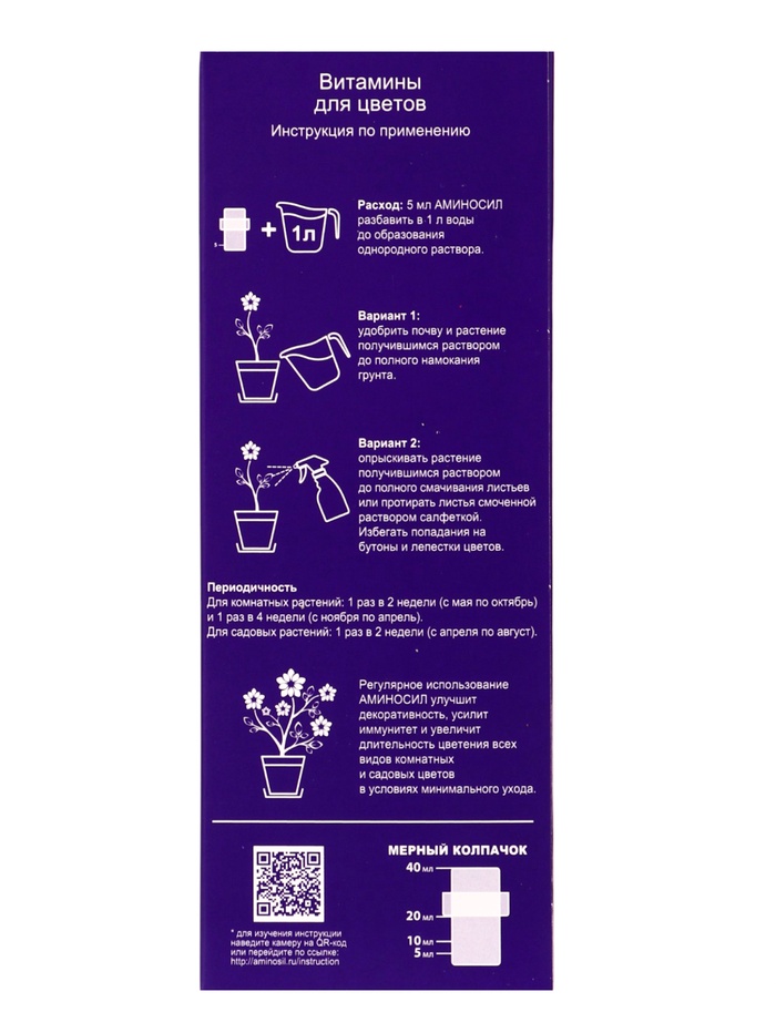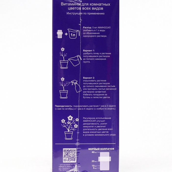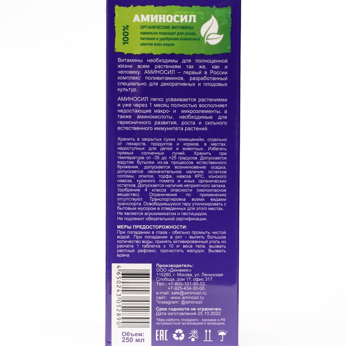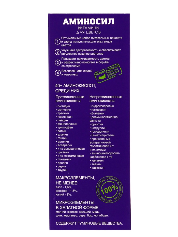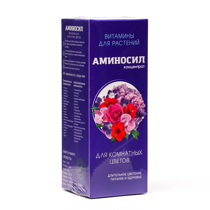 Габариты: 16,5 x 6,3 x 6,3 Доставка: Платная Страна: Россия В боксе: 8 шт Состав: См. на упаковке Материалы: см. на упаковке Фасовка: по 1 шт Индивидуальная упаковка: Термоусадочная пленка Сертификат: Не подлежит сертификации Вид средства: Удобрение Область применения: Для цветущих комнатных растений Происхождение: Минеральные (неорганические) Препаративная форма: Концентрат Вид: Удобрения Состав (действующее вещество): Фосфор, Азот, Калий Периоды применения: Круглогодичные Комплексные удобрения: Да Класс опасности: 3 класс (умеренно опасные) Группы элементов: Макроудобрения Эффект: Плодоношение, Блеск листьев Витамины Аминосил для комнатных цветов это специально разработанный комплексный продукт, который способен обеспечить все необходимые элементы питания для здорового и красивого роста самых разных комнатных растений. Удобрение содержит все важные макро и микроэлементы, которые способны улучшить здоровье и красоту, а также ингредиенты, которые способствуют более интенсивному и длительному цветению. Поможет укрепить корневую систему и улучшить общее состояние растений. Макро и микроэлементы. 40+ аминокислот. Рекомендуется использовать в течение всего периода роста и цветения. Это позволяет достичь максимального результата и обеспечить вашим комнатным растениям все необходимые элементы питания. Если вы хотите обеспечить здоровый и красивый рост своих растений, то удобрение для комнатных цветов - это идеальный выбор для вас. Оно подходит для ухода за самыми разными растениями и поможет создать прекрасный оазис красоты и здоровья в вашем доме. Жидкая подкормка для домашних балконных комнатных цветов (чайная бенгальская полиантовая роза, фиалки орхидеи бегонии).5 мл витаминного концентрата Аминосил разбавить в 1 л воды до образования однородного раствора.Вариант 1: поливать почву и растение получившимся раствором ближе к основанию до полного намокания грунта.Вариант 2: опрыскивать растение получившимся раствором до полного смачивания листьев или протирать листья смоченной раствором салфеткой. Избегать попадания на бутоны и лепестки цветов.Периодичность: подкармливайте растения 1 раз в 2 недели (с мая по октябрь) и 1 раз в 4 недели (с ноября по апрель).Оптимальный набор питательных веществ для всех цветов, выращенных в комнатных условиях;Улучшает декоративность* всех видов комнатных цветов в условиях минимального ухода;Комплексный эффект 4 в1: питание, усиление иммунитета, стимуляция роста и цветения; Комментарии к товару
