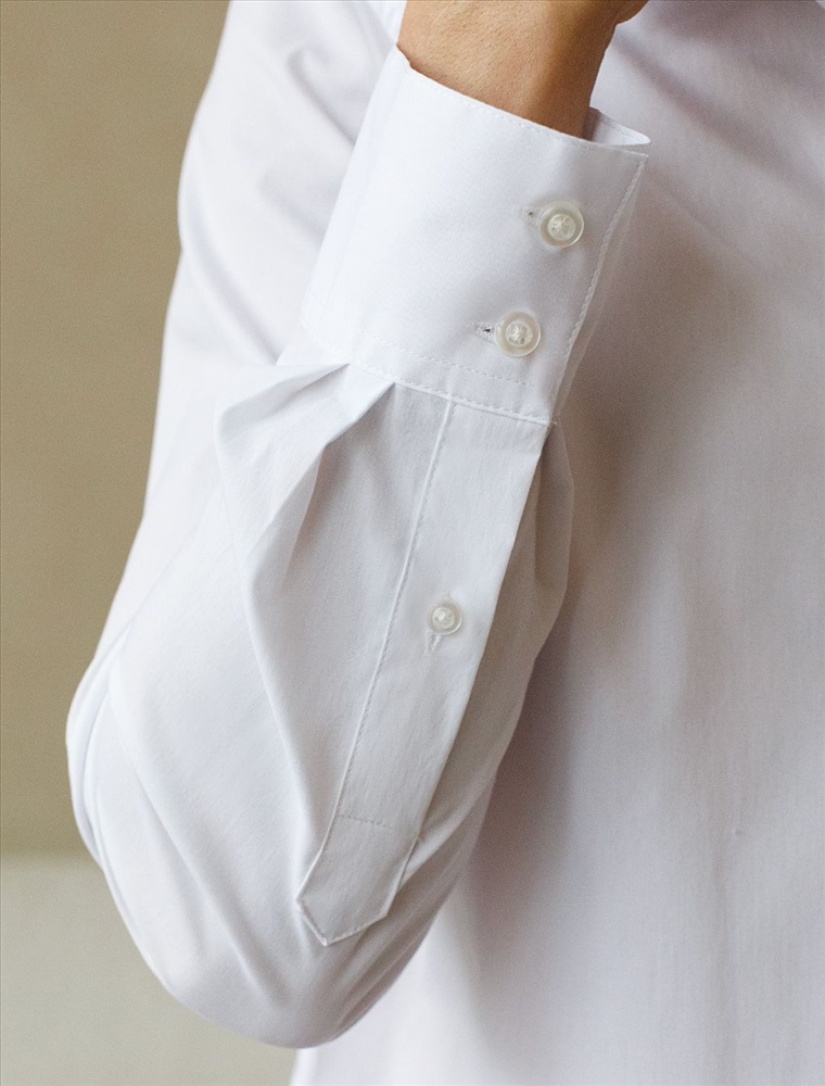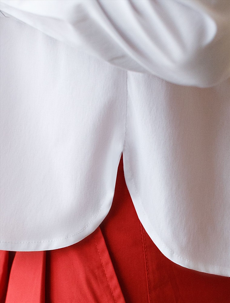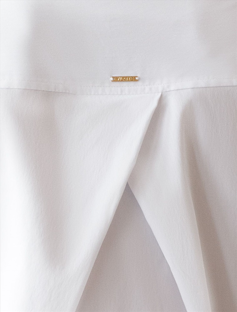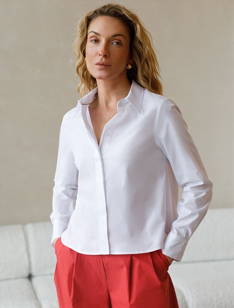 Стильная укороченная блузка белого цвета создана для комфорта в любой ситуации. Эластичный хлопок делает модель приятной для тела и хорошо дышащей, что особенно важно в течение долгого дня. Свободный крой не ограничивает движения, подходит на любую фигуру и гармонично смотрится в разных образах. Повседневная блузка держит форму даже после продолжительной носки, что помогает всегда выглядеть аккуратно. На спинке блузки расположена встречная бантовая складка с наклоном, что создаёт красивый визуальный эффект и придаёт дополнительный объем. Рукава обработаны широким манжетом на 2 пуговицы. Дополнительная пуговица на планке рукава не даёт раскрываться и топорщиться разрезу. Отложной воротник придает классический вид, подходящий для офисных будней. Особенно стильно рубашка смотрится в непринужденных, городских или повседневных комплектах.