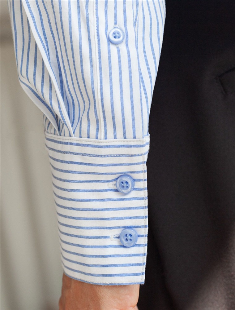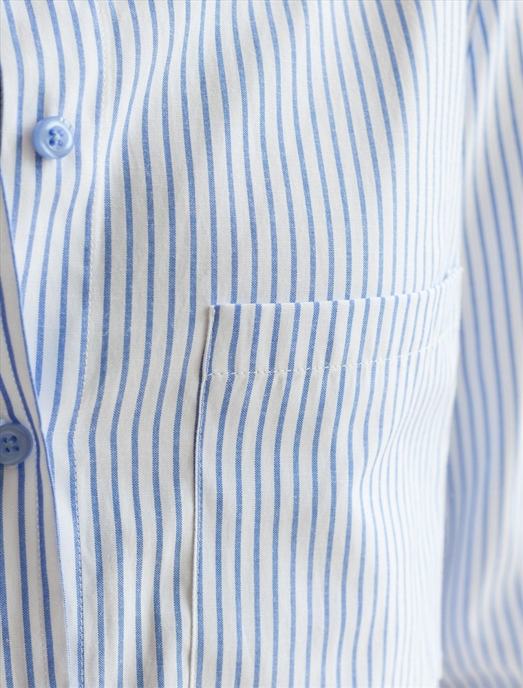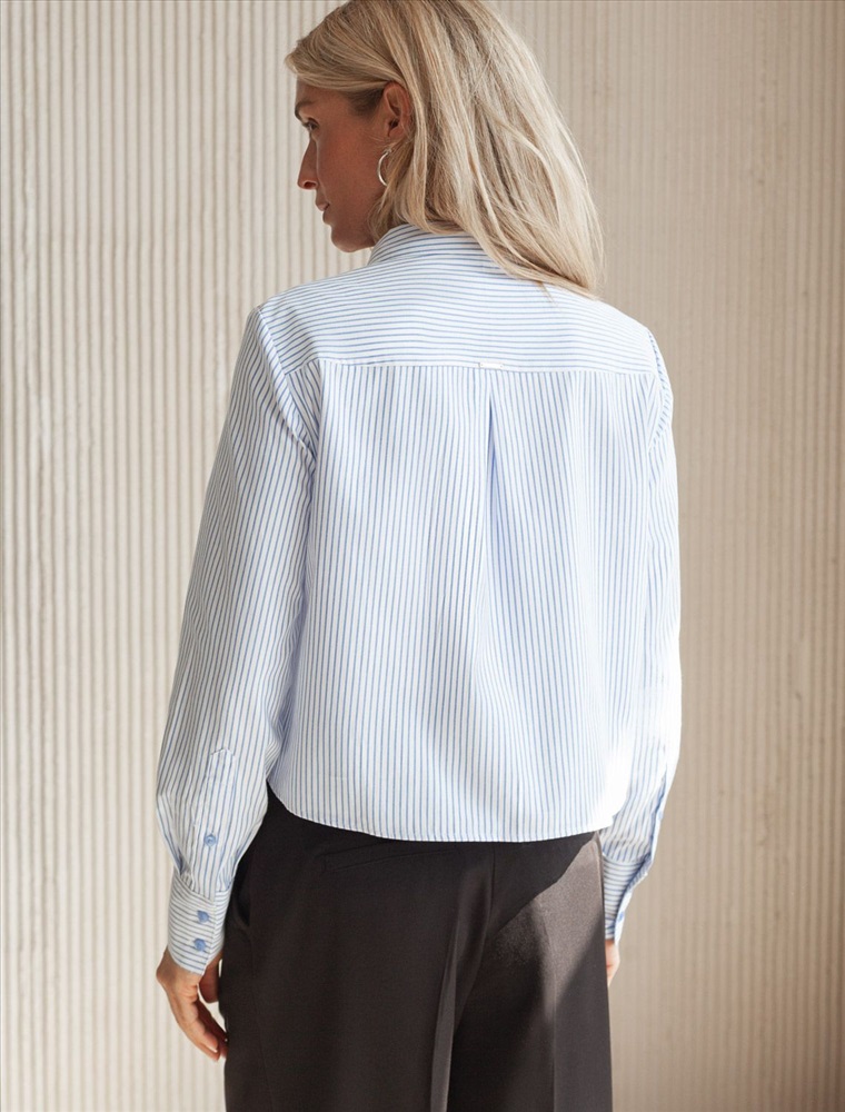 Укороченная блузка выполнена из хлопка. Лаконичная модель дополнена карманом. Изделие хорошо держит форму, что позволяет создать стильные строгие образы в офис. Чтобы подчеркнуть линию талии не теряя пропорций, сочетайте в комплекте с прямыми и широкими брюками. В более расслабленном образе – с джинсами трубами.