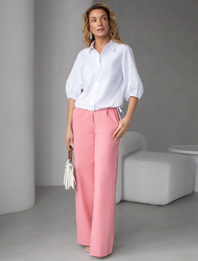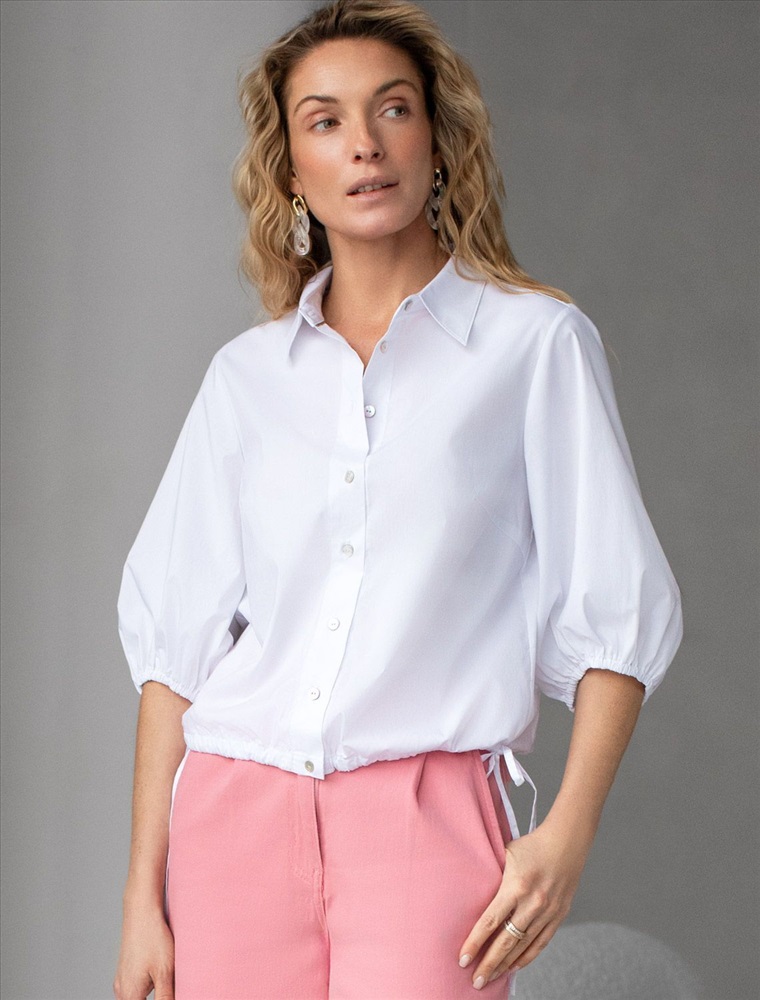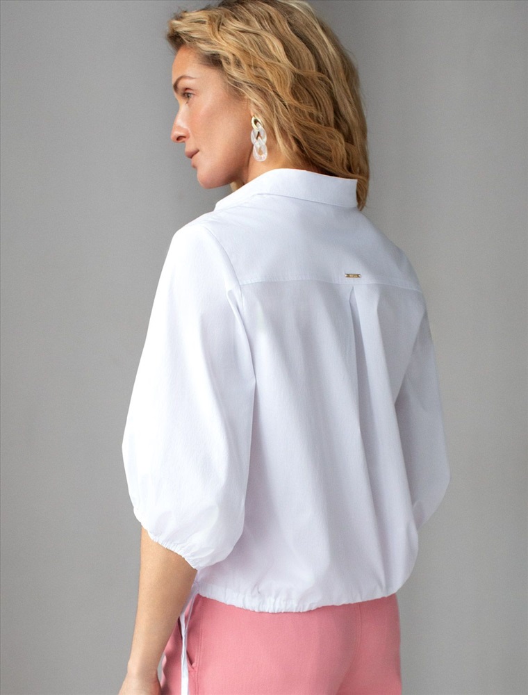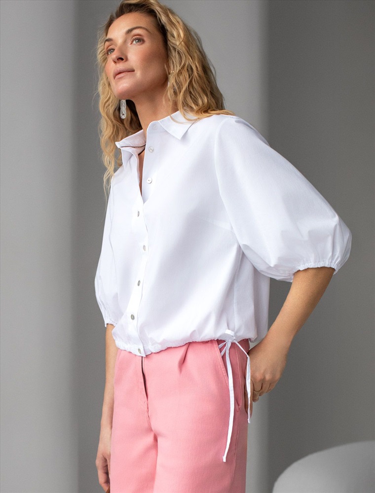 Укороченная блузка белого цвета из эластичного хлопка идеальна на весну и лето. Смешанный состав ткани идеален для деловых блузок: хлопок приятен к телу, полиэстер повышает долговечность, ПУ (эластан) придает комфортную растяжимость. Стильная модель с пышными рукавами буфами создает эффектный и женственный образ, который подойдет как для деловой работы, так и для повседневной носки. Блузка дополнена пуговицами из натурального перламутра — это экологичная долговечная фурнитура с уникальным сиянием. Практичная кулиска по низу держит форму изделия, подчеркивая талию и создавая аккуратный силуэт, а так же позволяет регулировать посадку, добавляя функциональности и удобства. Благодаря сочетанию качества материала и продуманного дизайна, рубашка хорошо сидит и на больших размерах, обеспечивая комфорт и свободу движений. Короткие рукава фонарики придают образу модный акцент, делая его более выразительным и динамичным. Натуральная ткань гарантирует комфорт и воздухопроницаемость, что особенно важно в теплое время года.