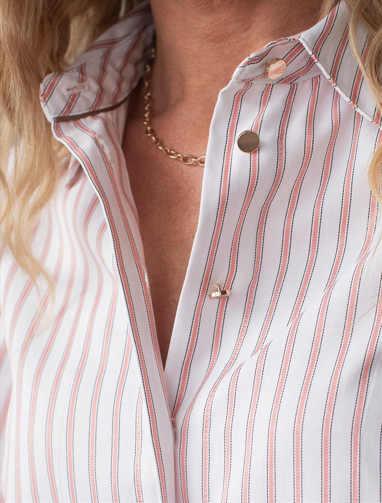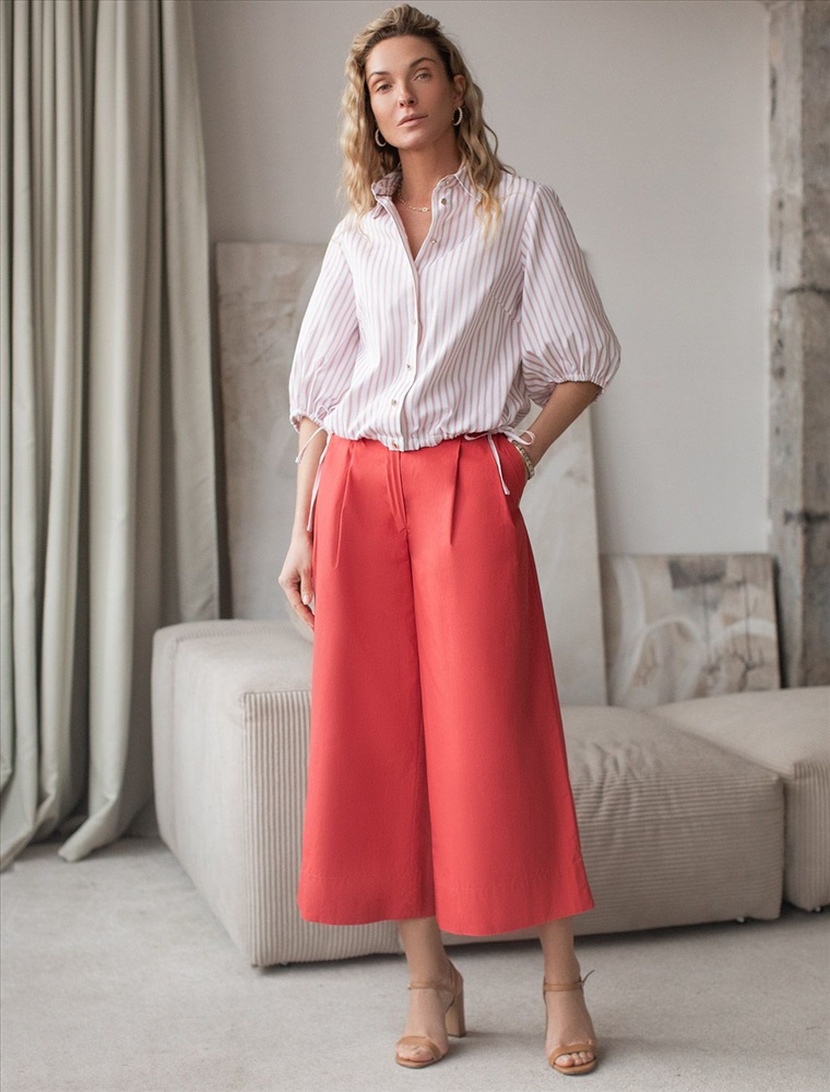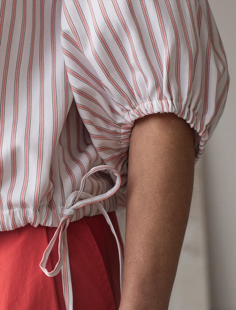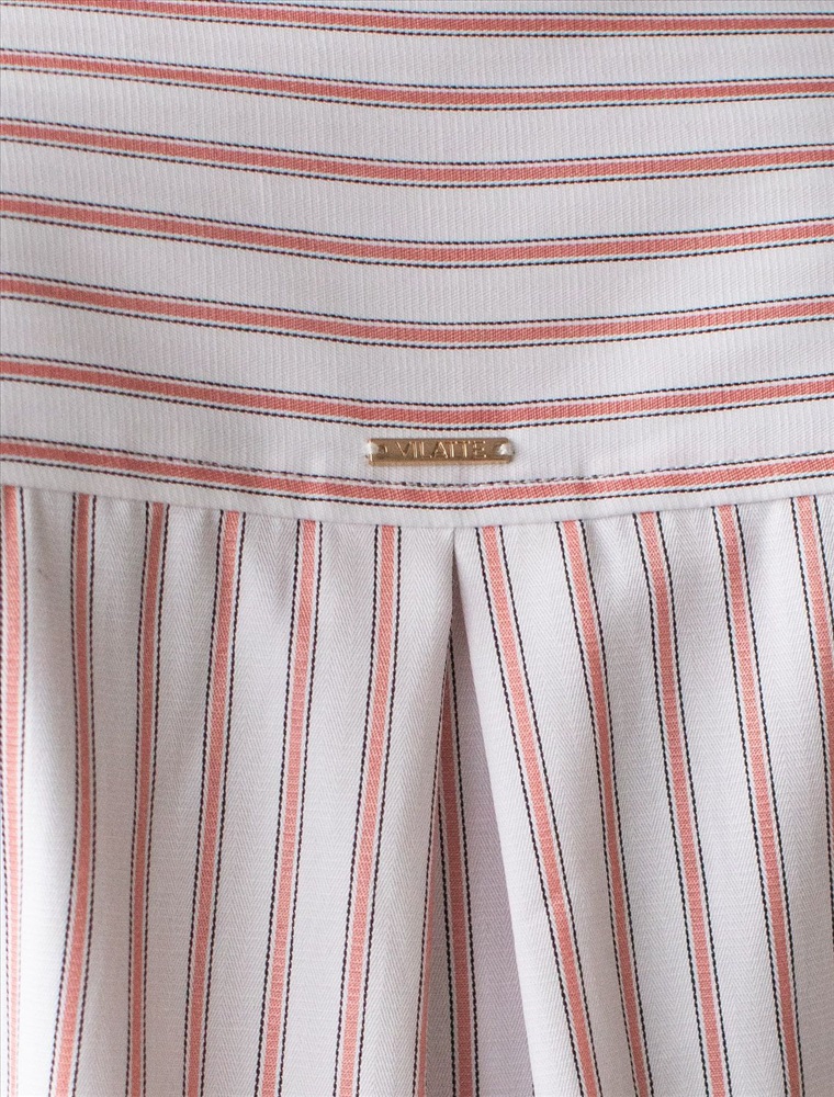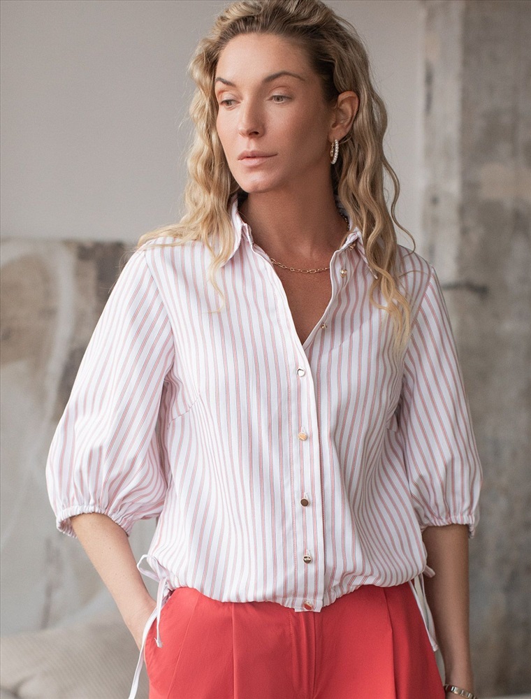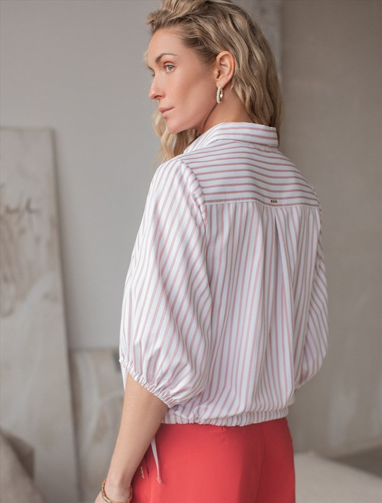 Укороченная блузка белого цвета в коралловую полоску из хлопка идеальна на весну и лето. Такой вид полосатой ткани называется пестротканой — полосы созданы переплетением нитей разных цветов. Смешанный состав ткани идеален для деловых блузок: хлопок приятен к телу, полиэстер повышает долговечность. Стильная модель с пышными рукавами буфами создает эффектный и женственный образ, который подойдет как для деловой работы, так и для повседневной носки. Блузка дополнена пуговицами из натурального перламутра — это экологичная долговечная фурнитура с уникальным сиянием. Практичная кулиска по низу держит форму изделия, подчеркивая талию и создавая аккуратный силуэт, а так же позволяет регулировать посадку, добавляя функциональности и удобства. Благодаря сочетанию качества материала и продуманного дизайна, рубашка хорошо сидит и на больших размерах, обеспечивая комфорт и свободу движений. Короткие рукава фонарики придают образу модный акцент, делая его более выразительным и динамичным. Натуральная ткань гарантирует комфорт и воздухопроницаемость, что особенно важно в теплое время года.