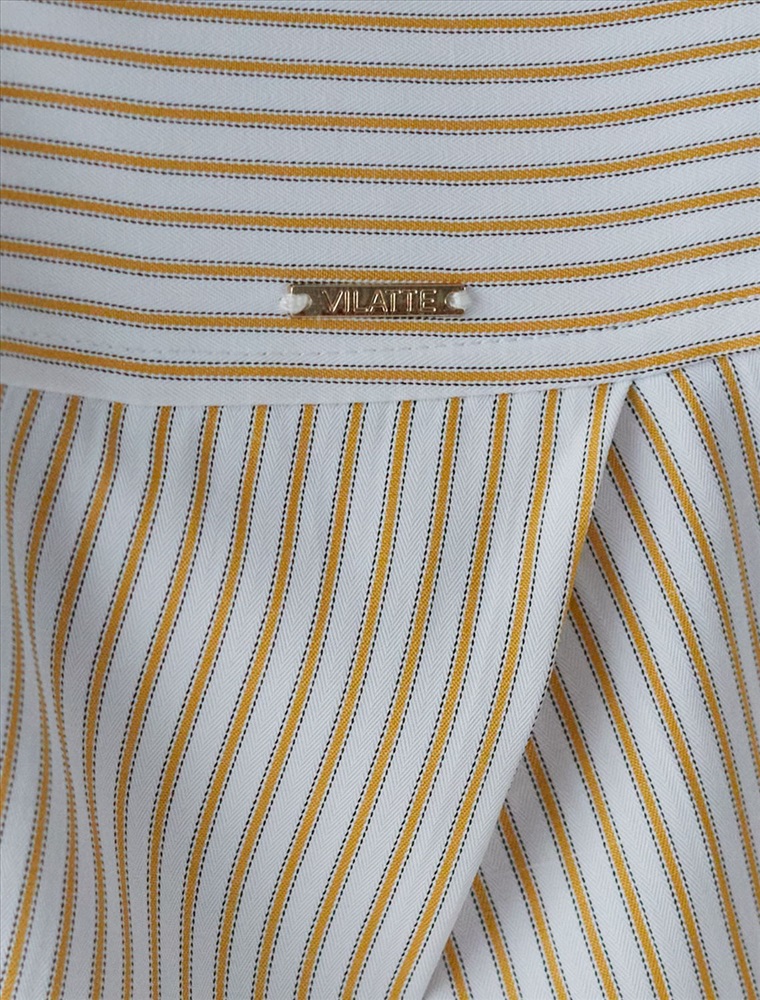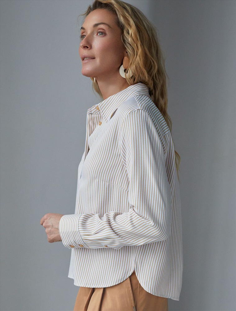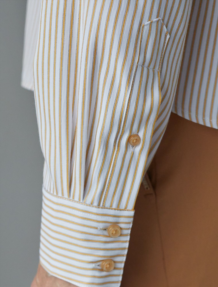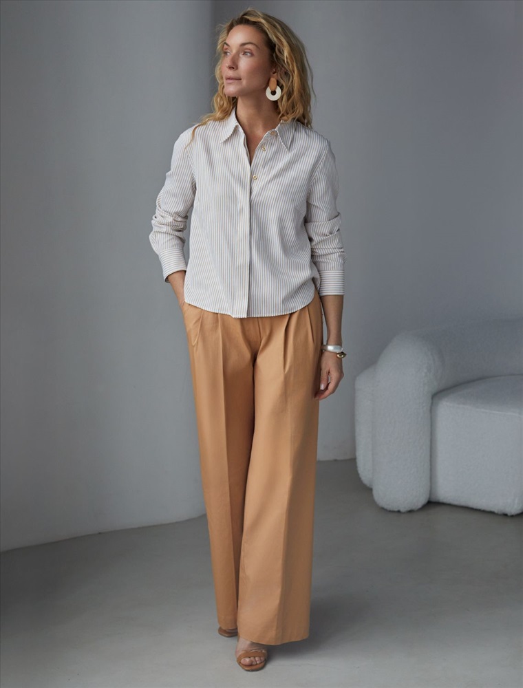 Стильная укороченная блузка белого цвета в бежевую полоску создана для комфорта в любой ситуации. Хлопок делает модель приятной для тела и хорошо дышащей, что особенно важно в течение долгого дня. Свободный крой не ограничивает движения, подходит на любую фигуру и гармонично смотрится в разных образах. Всегда актуальный принт в полоску визуально вытягивает и стройнит фигуру, добавляет образу динамики, делая блузку эффектным акцентом в гардеробе. Повседневная блузка держит форму даже после продолжительной носки, что помогает всегда выглядеть аккуратно. На спинке блузки расположена встречная бантовая складка с наклоном, что создаёт красивый визуальный эффект и придаёт дополнительный объем. Рукава обработаны широким манжетом на 2 пуговицы. Дополнительная пуговица на планке рукава не даёт раскрываться и топорщиться разрезу.. Отложной воротник придает классический вид,, подходящий для офисных будней. Особенно стильно рубашка смотрится в непринужденных, городских или повседневных комплектах.