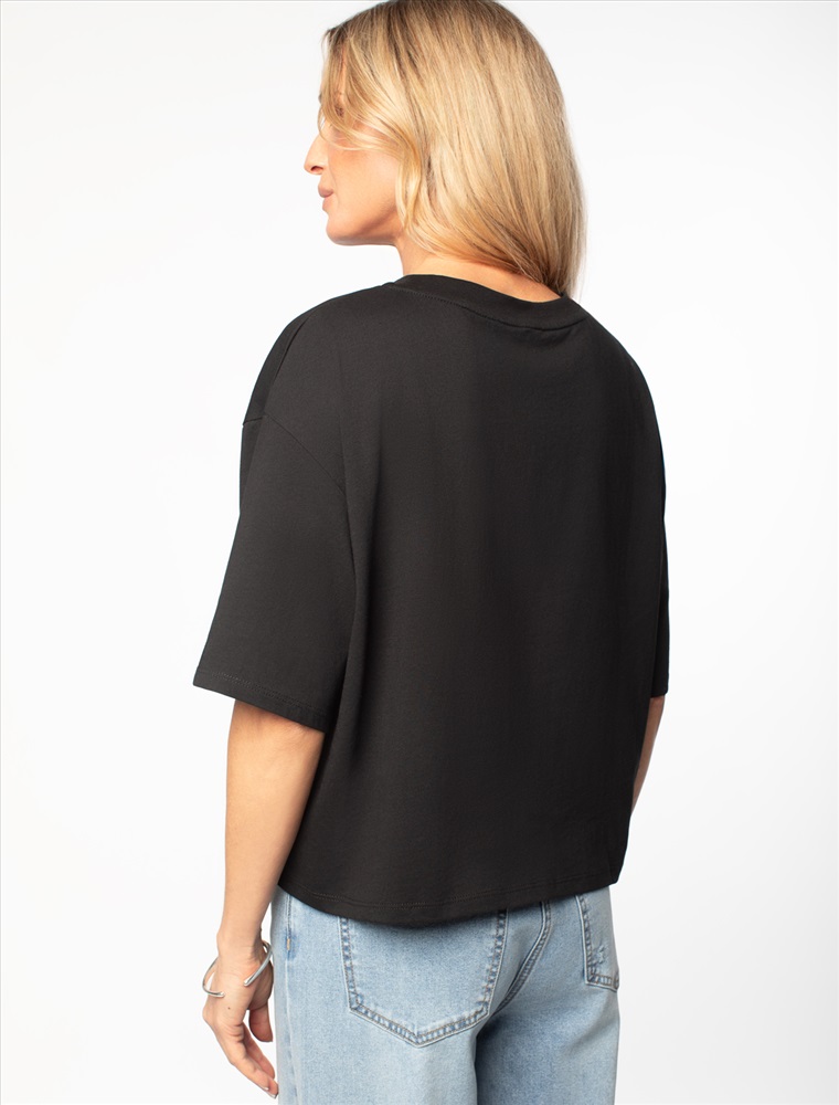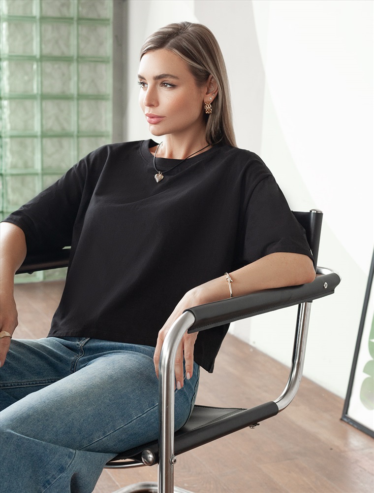 Базовая футболка из 100% хлопка. Укороченная модель свободной посадки идеально впишется в повседненвый гардероб. Изделие хорошо держит форму и обеспечивает комфортный микроклимат в течение дня.