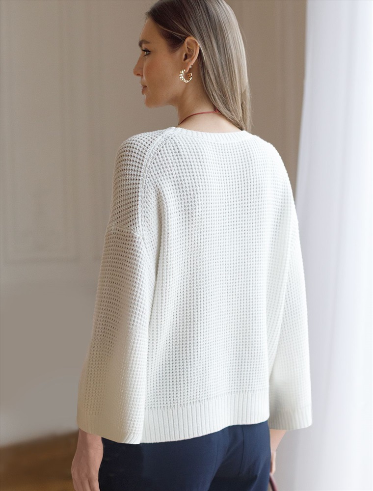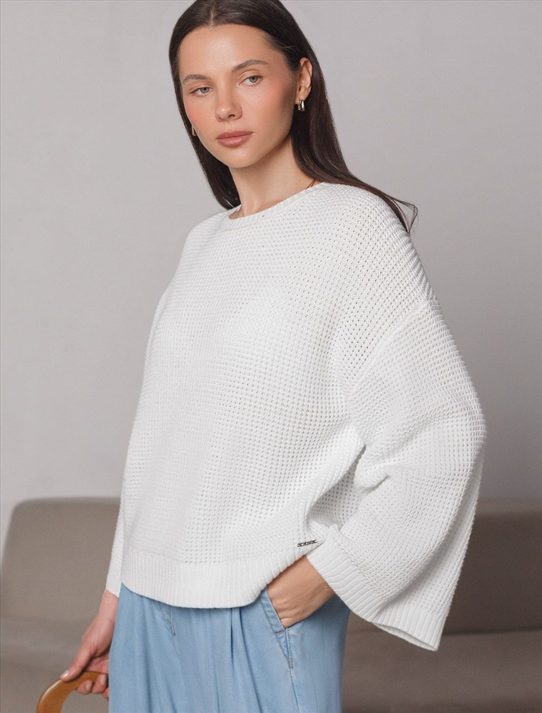 Стильный укороченный джемпер белого цвета создан для тех, кто ценит современный образ и комфорт. Свободный крой подчеркивает легкость и позволяет чувствовать себя уютно в любой ситуации. Рельефная вязка в виде оригинального узора "шашечки" добавляет джемперу выразительности. Благодаря натуральному хлопку повседневный джемпер обеспечивает комфорт даже в жаркие дни: хлопок позволяет коже дышать и поддерживает оптимальный микроклимат. А акрил в составе придает мягкость, отличную цветостойкость, а также гипоаллергенность и устойчивость к деформации, что делает джемпер легким в уходе. Круглый ворот и спущенная линия плеча добавляют образу аккуратности и расслабленности. Широкие рукава создают воздушность и делают силуэт особенно женственным. Такой джемпер легко сочетать с широкими и узкими низами для создания повседневного или более нарядного ансамбля. Джемпер отлично подойдет для прохладных весенних и летних дней благодаря плотности материала, а также станет удачным решением для многослойных луков. Вязка подчеркивает индивидуальность вещи и привлекает внимание к деталям вашего стиля.