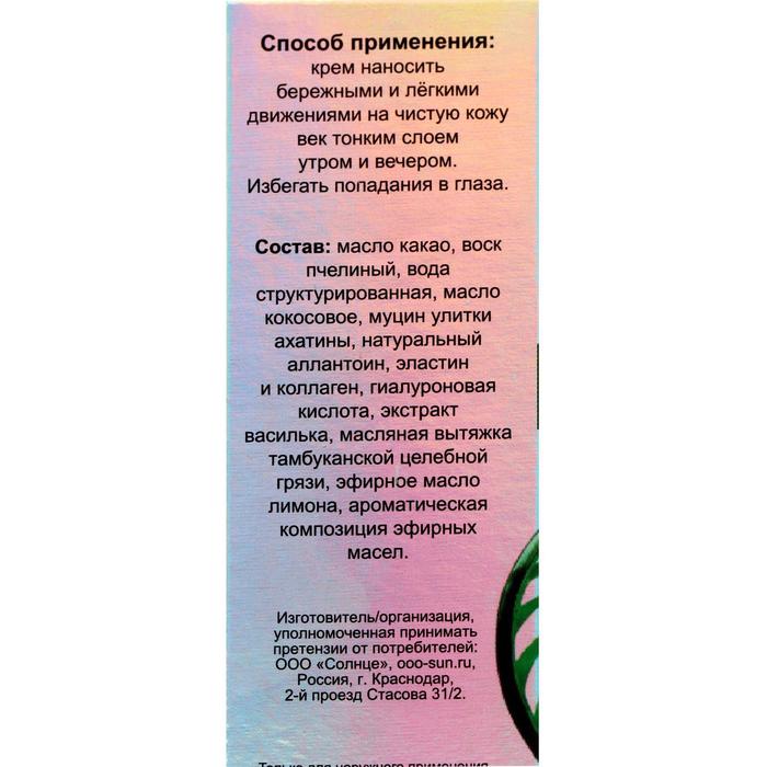 Способ применения: наносить бережными и лёгкими движениями на чистую кожу век тонким слоем утром и вечером. Не массировать и не втирать! Избегать попадания в глаза.
