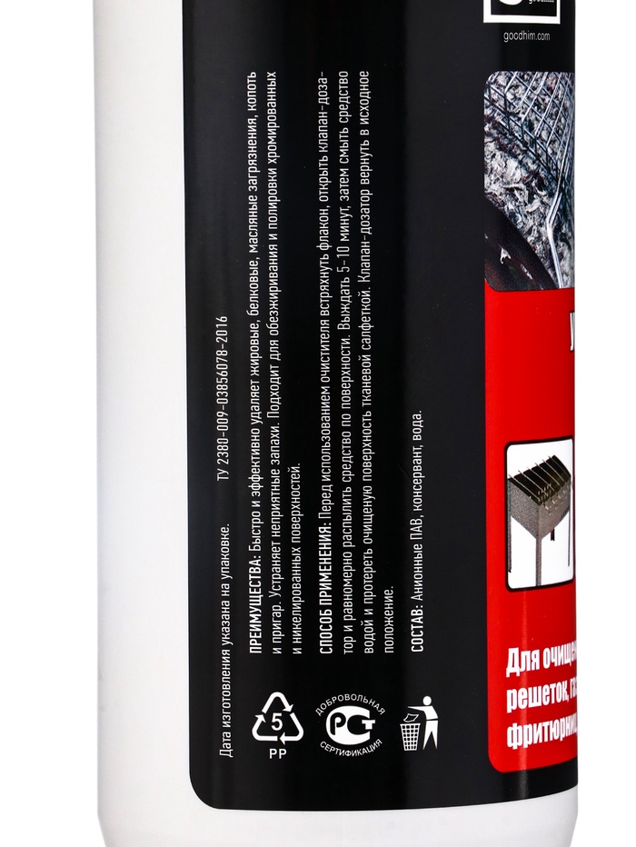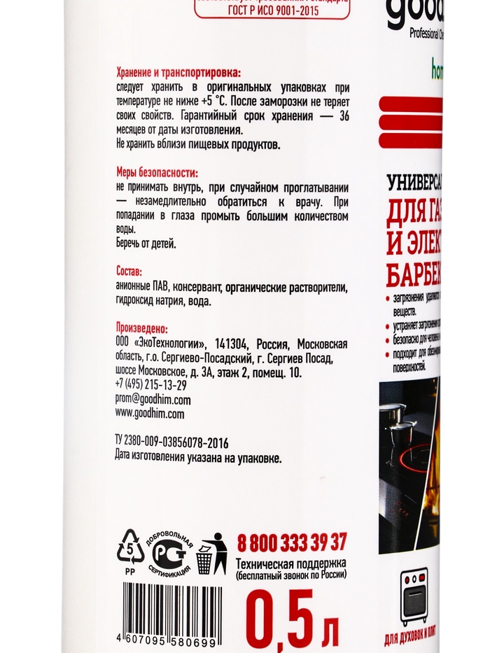 Габариты: 6,5 x 6,5 x 20 Страна: Россия В боксе: 16 шт Состав: См. на упаковке Материалы: см. на упаковке Фасовка: по 1 шт Индивидуальная упаковка: Без упаковки Сертификат: Не подлежит сертификации Вес, г/Объём, мл: 500 Универсальный очиститель Goodhim, 0,5 л – надёжное средство для быстрой и эффективной очистки газовых и электрических плит, духовых шкафов, мангалов и барбекю. Формула глубоко проникает в загрязнения, растворяет жир, нагар и копоть, облегчая уход даже за сильно загрязнёнными поверхностями. Преимущества: