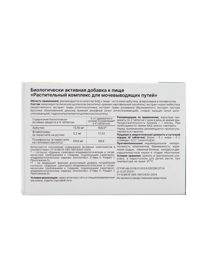 Состав: микрокристаллическая целлюлоза и крахмал картофельный (носители), экстракт корня любистка лекарственного, экстракт травы золототысячника, экстракт травы розмарина обыкновенного, экстракт листьев брусники обыкновенной, диоксид кремния аморфный и стеарат кальция (агенты антислёживающие).
