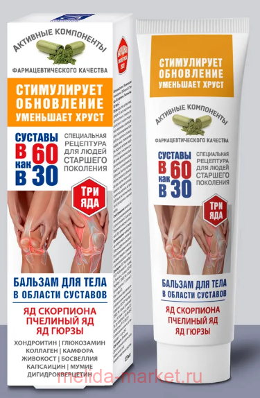 Бальзам для тела «В 60 как в 30 три яда» для суставов и позвоночника (производство Россия наукоград Королев) благодаря своему эффективному природному составу активизирует механизмы регенерации хрящевой ткани и содействует комплексному оздоровлению опорно-двигательного аппарата.