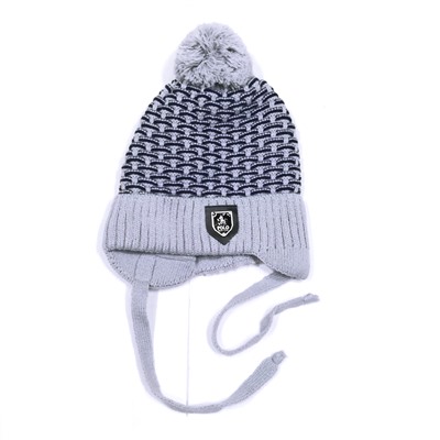 Шапка с помпоном для мальчика. Вязаная ткань из шерсти и акрила, полотно при вязании декорировано узором «Чешуйка дракончика». Модель на подкладе из трикотажа. Однослойная. Снизу с отворотом, полукруглыми ушками и завязками. На отвороте изделие украшено декоративной нашивкой.