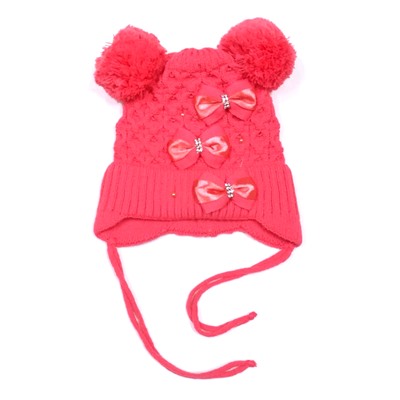 Доп. параметр: Утепленный Страна: Россия Состав: 50% шерсть, 50% акрил Материал: Вязаный трикотаж Описание и замерыШапочка для девочки, вязаная из шерсти и акрила, с рельефными рисунками, с двумя помпонами из пряжи. Снизу с отворотом, полукруглыми ушками и завязками. Украшена бантиками из вязаной и атласной лент, отделанных стразами.Комментарии к товару