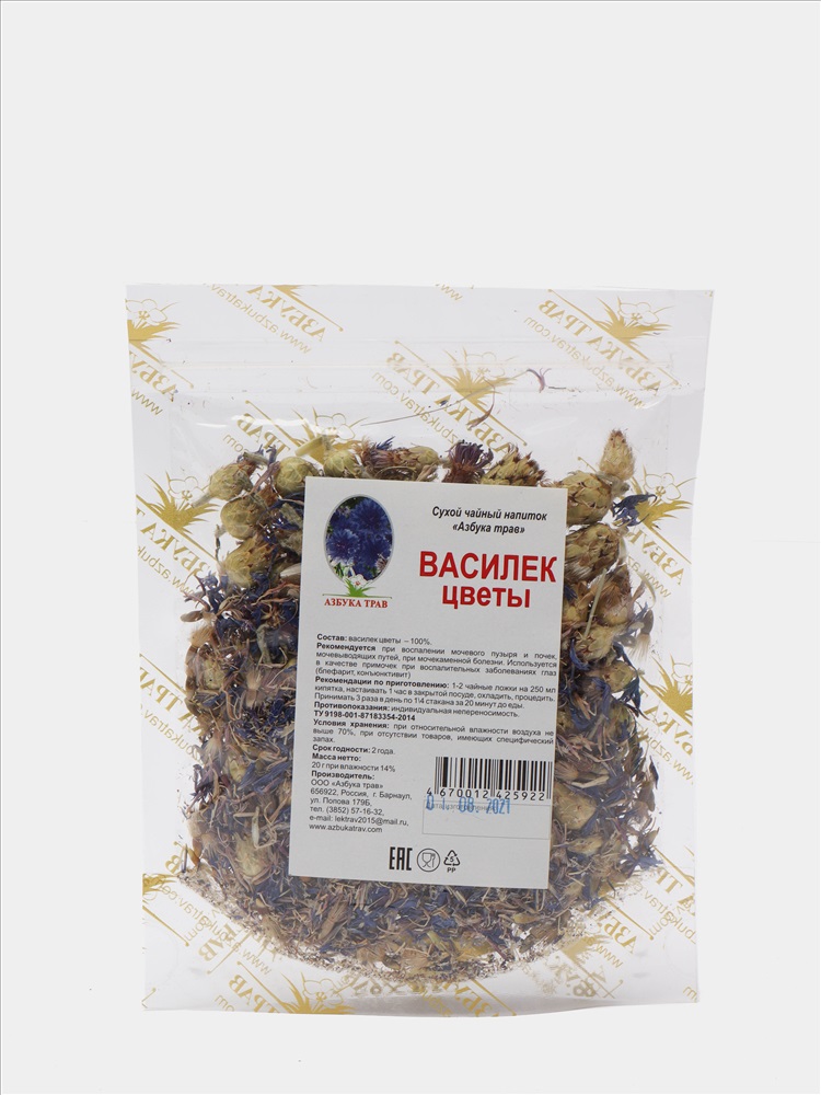 Рекомендации по приготовлению: 1-2 чайные ложки цветков василька настаивать 1 час в закрытой посуде в 1 стакане кипятка, охладить, процедить. Принимать по 1/4 стакана 3 раза в день за 20 минут до еды.