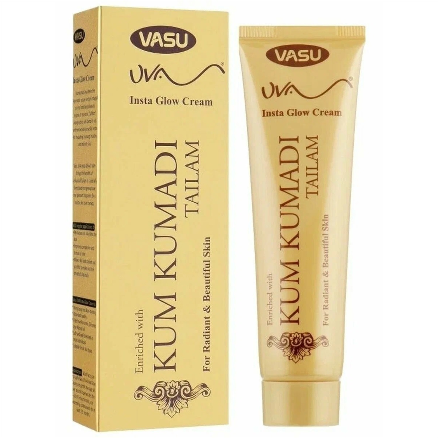 Brand: Vasu Вес/Объем/ колч: 50 Мл/уп/г: г по типу средств: Лосьон Продается как: шт. «Ува Инста Глоу» (Uva Insta Glow Cream Vasu) — омолаживающий крем для лица с маслом кумкумади, производится в Индии. Состав: масло кумкумади (шафрановое масло, обогащённое 12 натуральными компонентами) — 25%, кремовая база, консервант (феноксиэтанол IP), краситель. Комментарии к товару