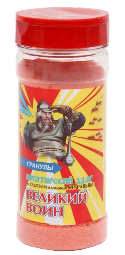Гранулы от муравьев "Великий воин", 150 г. Средство для уничтожения муравьев Великий Воин помогает быстро и эффективно избавиться от насекомых дома и на участке. Применение препарата от насекомых: гранулы для уничтожения муравьев размещают на подложках из непищевых материалов, которые расставляют в местах обитания, скопления или передвижения насекомых, либо насыпают их непосредственно на муравейники или Муравьиные дорожки. Для уничтожения рыжих домовых муравьев в ванных, душевых, санузлах или около путей их передвижения можно размещать на подложках сухие гранулы или смачивать их водой до получения пасты, которую следует нанести на пути передвижения (дорожки) муравьев. Для уничтожения садовых муравьев в отмостках домов, коттеджей, на садовых дорожках рассыпают гранулы в щели между плитками и в других местах скопления и на путях их передвижения в сухую безветренную погоду. Для уничтожения садовых муравьев на верандах, террасах, в теплицах и в других помещениях можно использовать как сухие гранулы, размещая их на подложках, либо насыпая их непосредственно на муравейники или Муравьиные дорожки, так и смоченные водой до образования пасты, которую можно наносить вдоль порога или по периметру веранды или других сооружений. Комментарии к товару