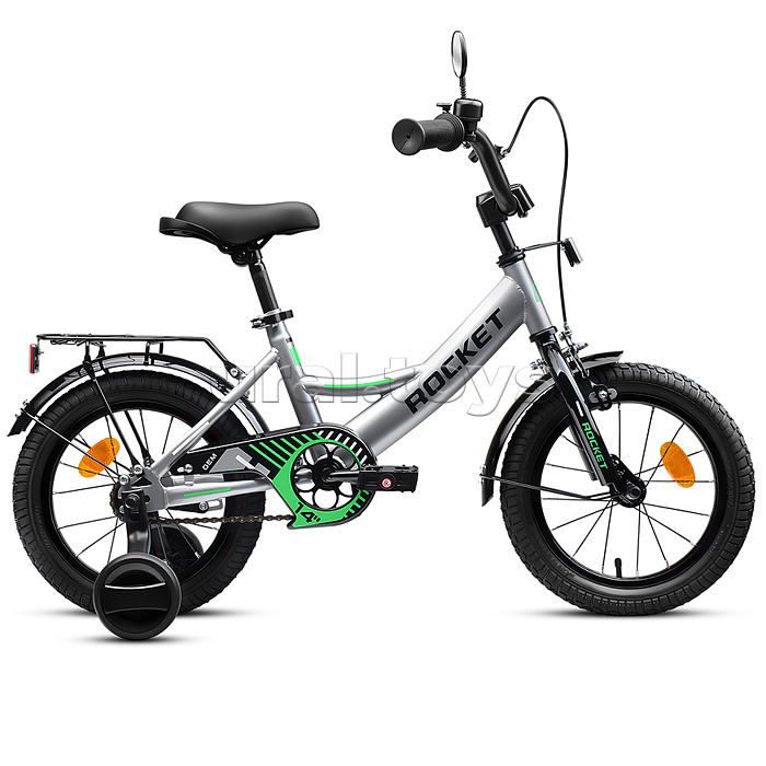 • Яркий фирменный стиль ТМ ROCKET не оставит равнодушным ни одного ребенка! • Отлично держит дорогу за счет резиновых надувных колес, размером 14 дюймов. • В комплекте имеются дополнительные учебные колёса. • Сиденье из ПВХ, можно регулировать по высоте (53-61 см.) • Металлические брызговики защитят маленького велосипедиста от загрязнений. • Велосипед оснащен передним клещевым и задним ножным тормозами. • Ширина руля: 50 см, оснащен противоскользящими прорезиненными ручками. • Велосипед подходит для детей 4-6 лет, ростом от 105 до 120 см. • Габаритные размеры велосипеда: 112 х 50 х 71 см. • В комплекте звонок на руль. • Металлический багажник. • Максимальная нагрузка: 50 кг. • Вес велосипеда без упаковки: 9.2 кг. • Рама: сталь. • Вынос: резьбовой. • Вилка: жесткая стальная. • Покрышки: 2,125.