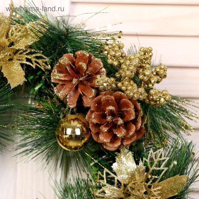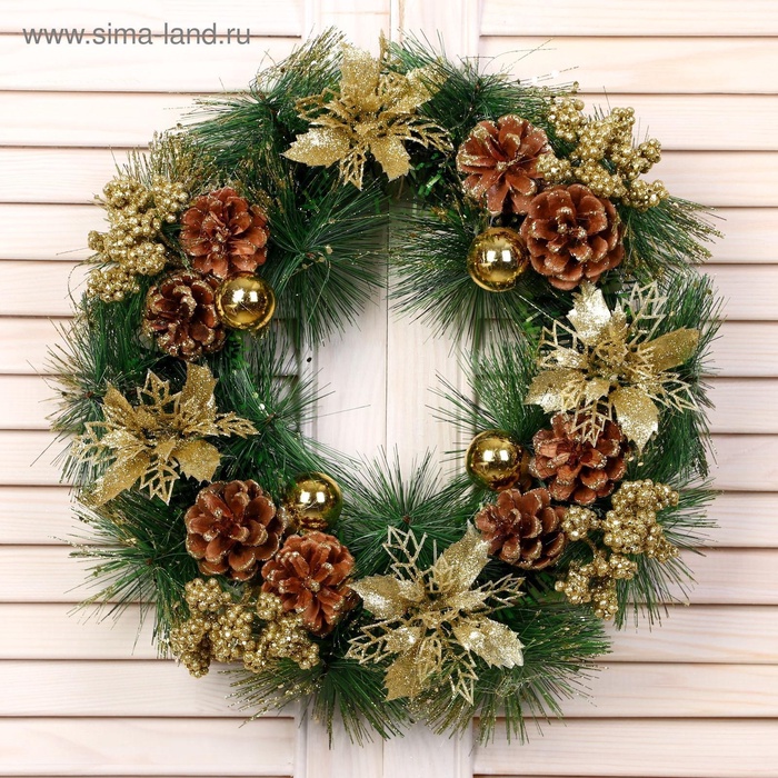 Создаём атмосферу праздника Этот венок — не просто украшение, а символ уюта и праздничного настроения, который наполняет пространство светом и теплом. Его золотистые оттенки и изящные детали вызывают ассоциации с традиционными рождественскими мотивами, придавая интерьеру глубину и богатство. Венок легко вписывается в разные стилистические решения, дополняя и подчёркивая общую концепцию декора. Использование такого украшения помогает создать цельный и выразительный образ, который становится центром внимания и объединяет пространство. Он приносит в дом ощущение торжества и семейного единства, делая зимние праздники особенно запоминающимися и тёплыми. КомплектацияВ комплект входит один венок диаметром 30 см. Комментарии к товару