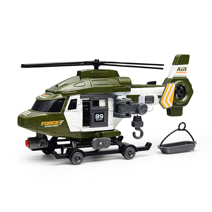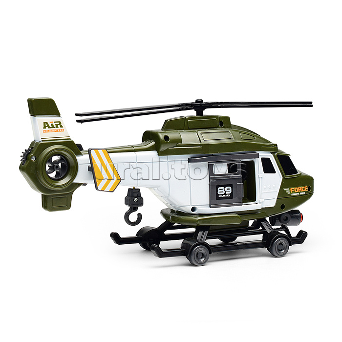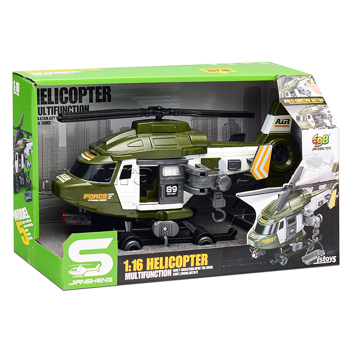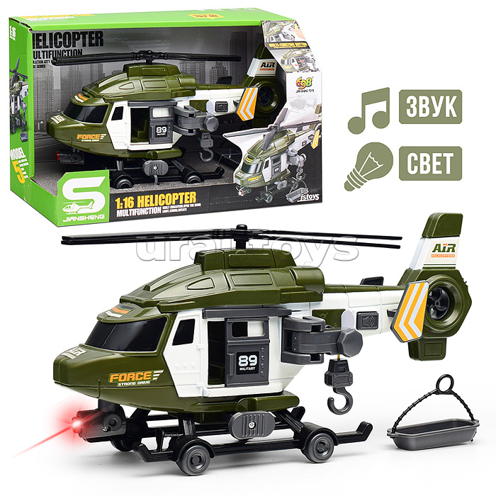 Код: 484749 Штрихкод: 6904110174368 Страна производитель: Китай Размеры упаковки: 31 x 12 x 18.5 см Количество в коробке: 36 • Размеры вертолёта: 28х10х14 см. • Функции: - открывающиеся двери. - при нажатии на рычаг, вращается пропеллер. - при нажатии кнопки на хвосте, горит прожектор и раздаются звуки работы вертолёта. - сбоку установлен крюк на верёвке. • Свет и звук работают от 3-х батареек "AG13" (входят в комплект для демонстрации) • Соответствует требованиям безопасности продукции. • Для детей от 3-х лет. Комментарии к товару