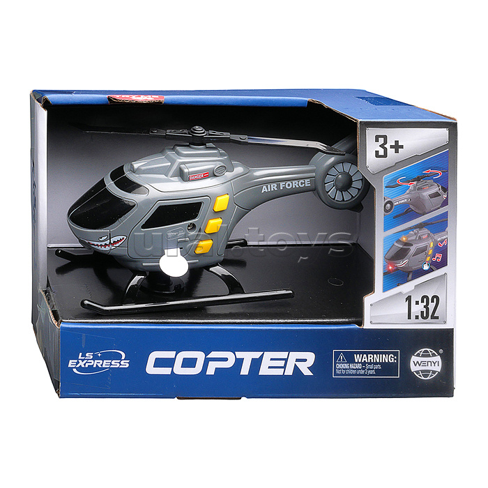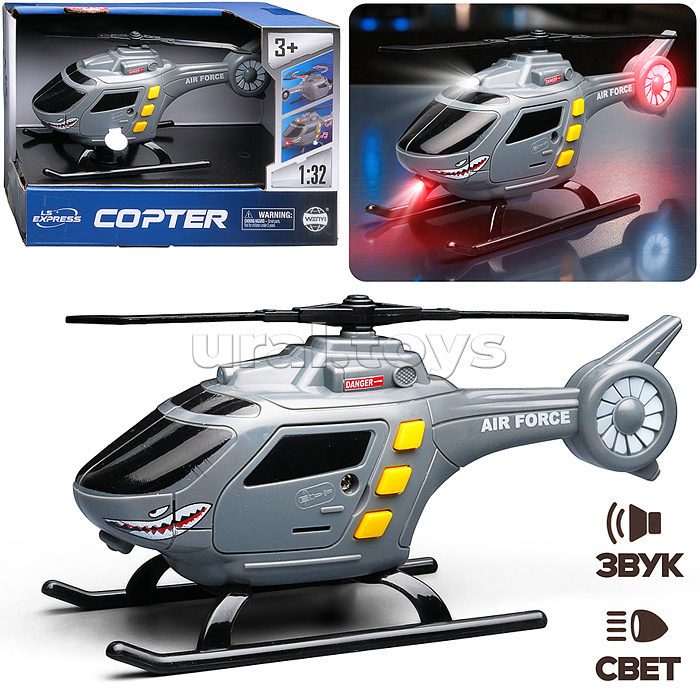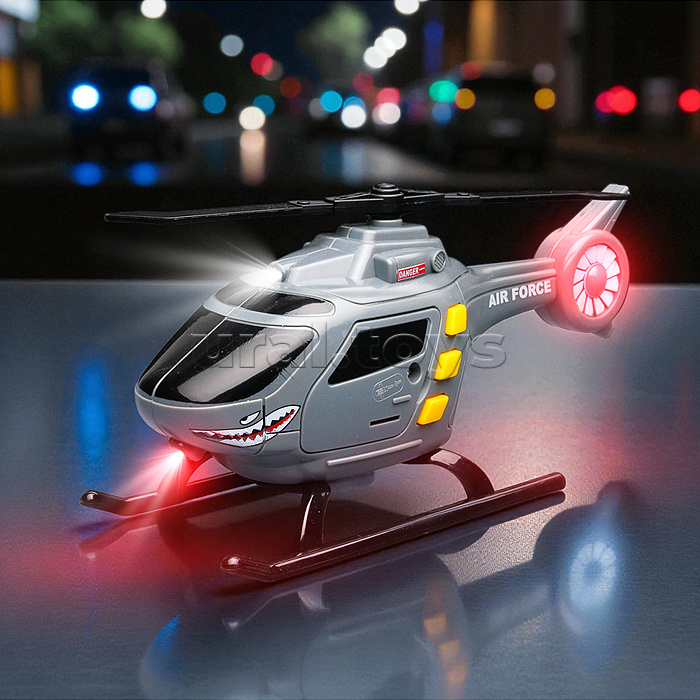 Код: 496357 Штрихкод: 6904111988377 Страна производитель: Китай Размеры упаковки: 8.5 x 19 x 12.5 см Количество в коробке: 96 • Размеры игрушки: 15.5х5.5х7 см. • Вращающийся винт. • При нажатии кнопок на корпусе, воспроизводятся звуки вертолёта, сирены и горят лампочки. • Звук и свет работают от 3-х батареек "AG13" (входят в комплект для демонстрации) • Материал: пластик. • Соответствует требованиям безопасности продукции. • Для детей от 3-х лет. Комментарии к товару