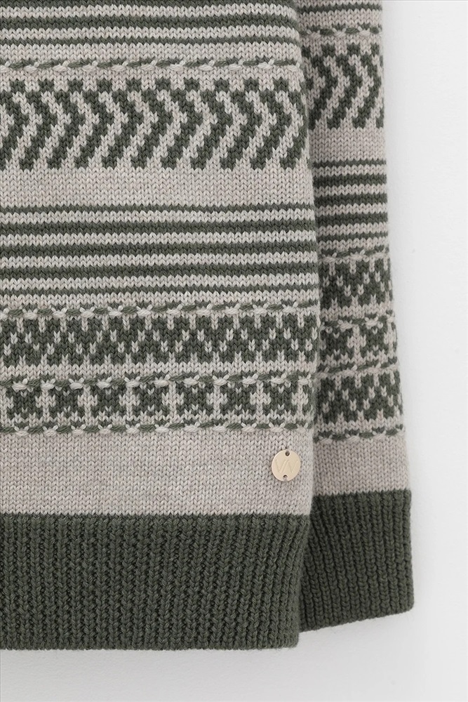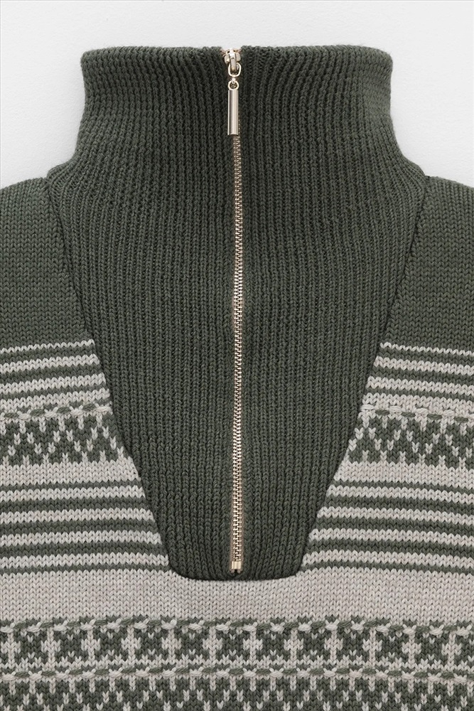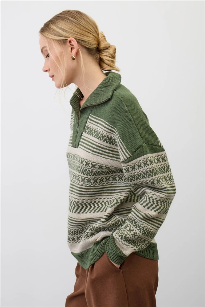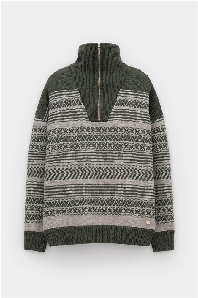 Изысканный джемпер в скандинавском стиле создан из высококачественной пряжи с применением передовой технологии смешанных волокон. Тонкое сочетание шерсти и акрила создает непревзойденный комфорт: модель мягко подчеркивает силуэт, обеспечивает нежное прикосновение и сохраняет безупречную посадку. Стильный воротник-стойка с элегантной застежкой-молнией завершает продуманный дизайн.