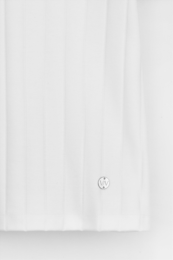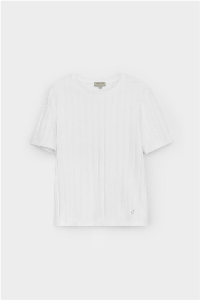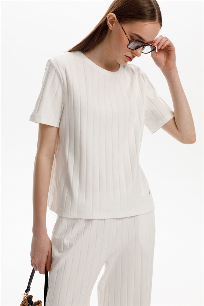 Базовая футболка из 100% гребенного хлопка. Необычное переплетение в виде широких полос придает изделию оригинальность, добавляя фактуры и динамики в образ. В сочетании с брюками из этой коллекции, вы создадите стильный образ для летних дней.