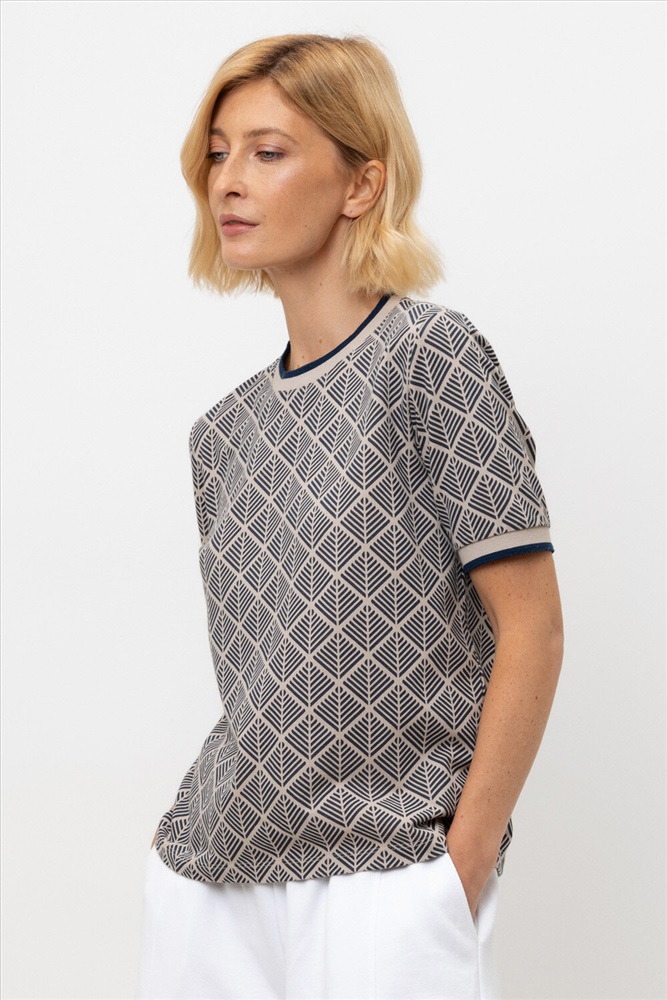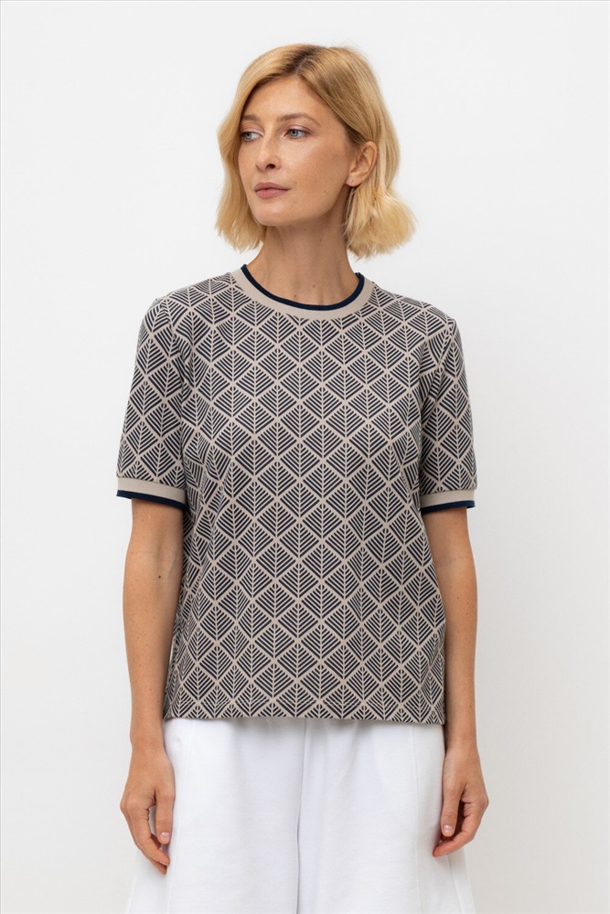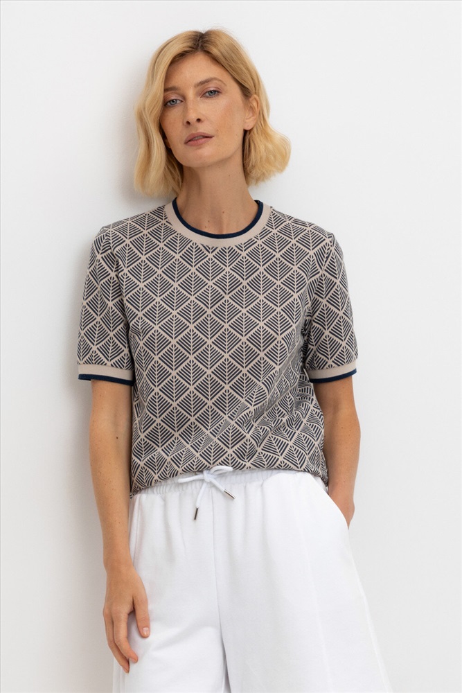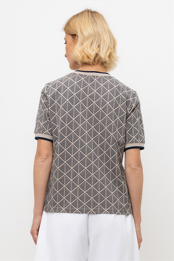 Футболка, изготовленная из 100% хлопка в переплетении пике. Дарит ощущение комфорта и легкости. Теплый сероватый оттенок и геометрический узор придают изделию спортивный и одновременно романтический стиль. Вязаный воротник и манжеты, выполненные с особым вниманием к деталям, придают изделию аккуратный и завершенный вид.