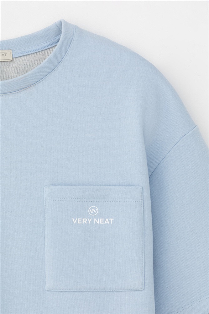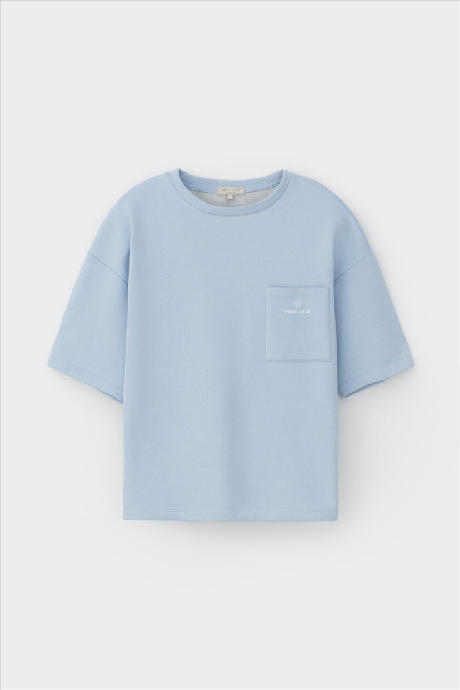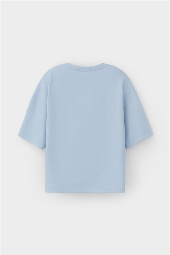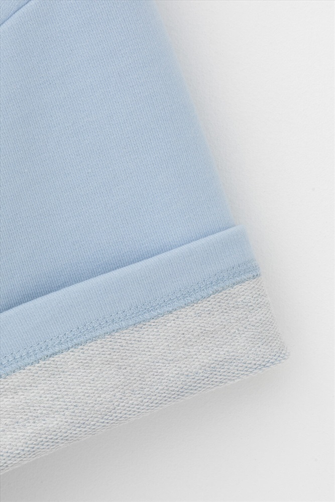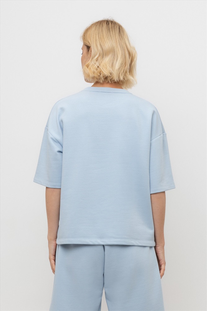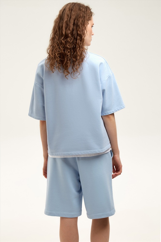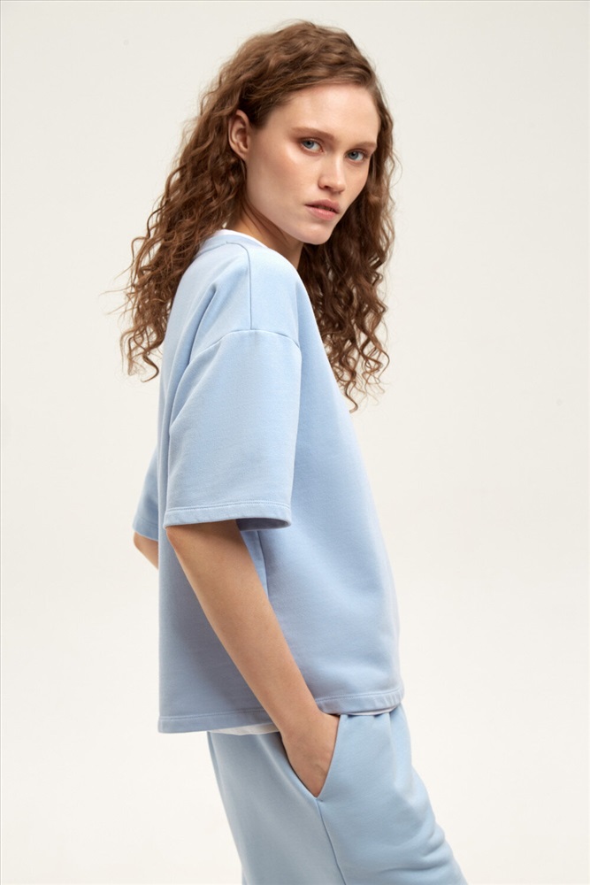 Футболка из мягкого двухцветного футера. Внутренняя сторона изделия представлена в натуральном цвете хлопка, внешняя в нежно-голубом. За счет использования крашенной пряжи, данный вид полотна прошел минимальную обработку, что придало изделию мягкость и шелковистость.