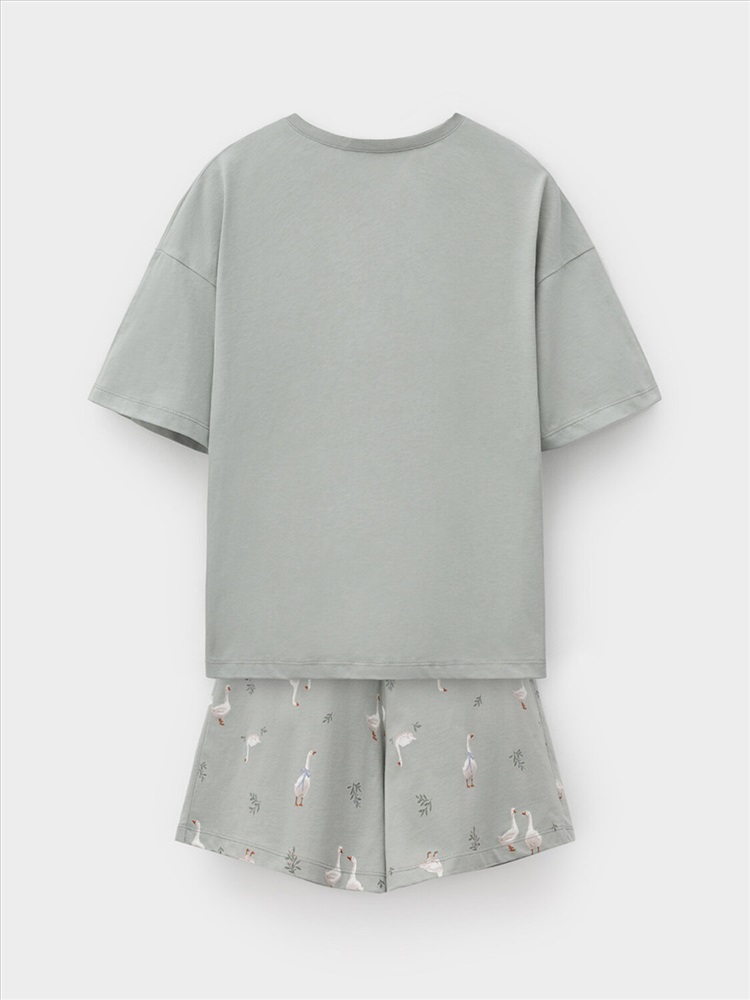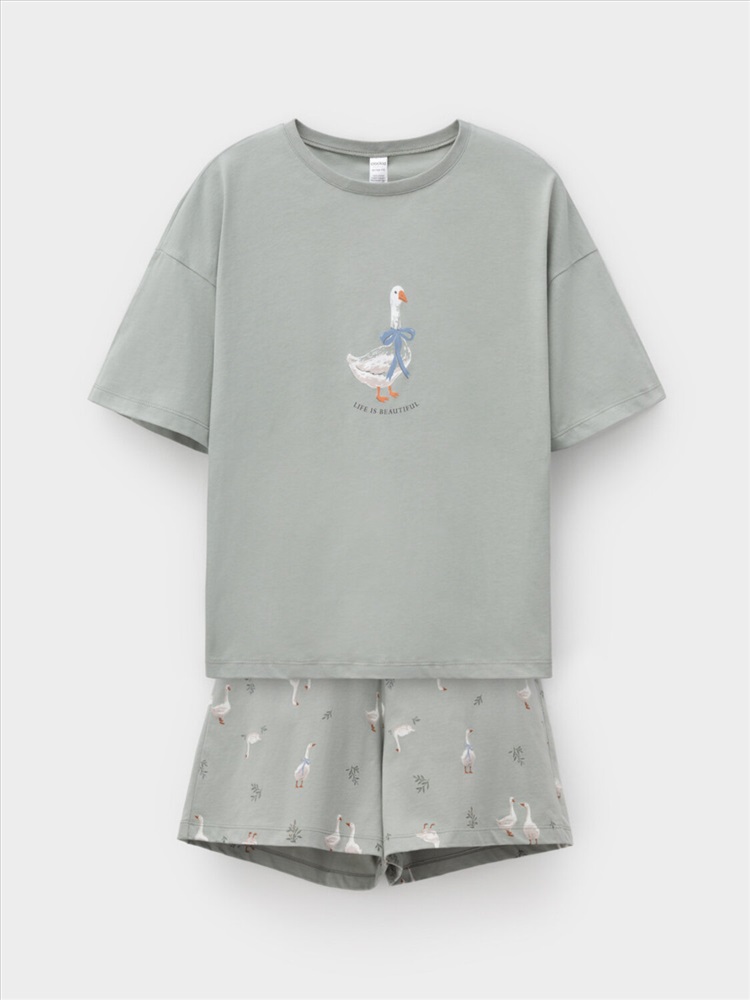 Комплект для комфортного сна и отдыха из трикотажного полотна с набивным рисунком и принтом. Футболка с короткими спущенными рукавами и шорты с мягкой эластичной резинкой в поясе, которые удобно садятся по фигуре. Гладкий материал приятен к телу, не теряет форму и позволяет коже дышать.