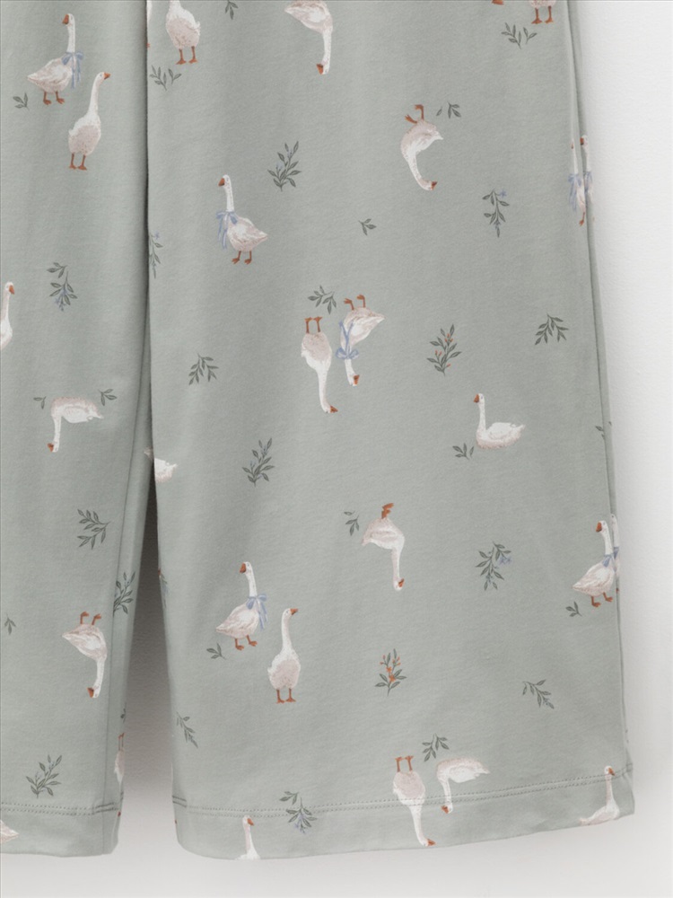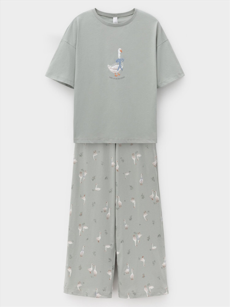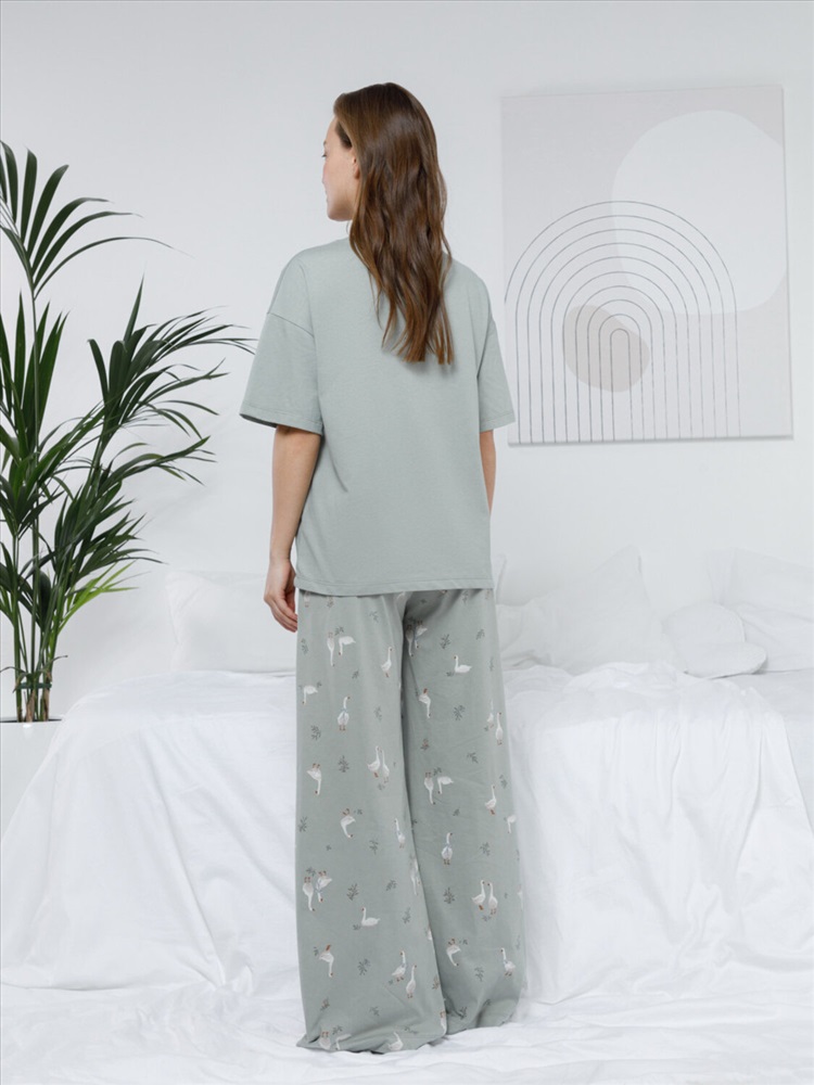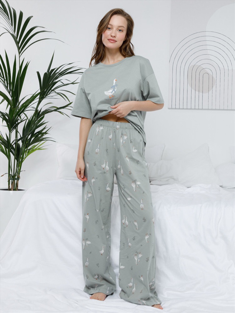 Комплект для комфортного сна и отдыха из гладкого трикотажного полотна. Футболка с короткими спущенными рукавами и прямые брюки с мягкой эластичной резинкой в поясе, которые удобно садятся по фигуре. Лёгкий материал приятен к телу, не теряет форму и позволяет коже дышать. Все трикотажные полотна производятся в соответствии с нормами швейцарского сертификата ЭкоТекс.