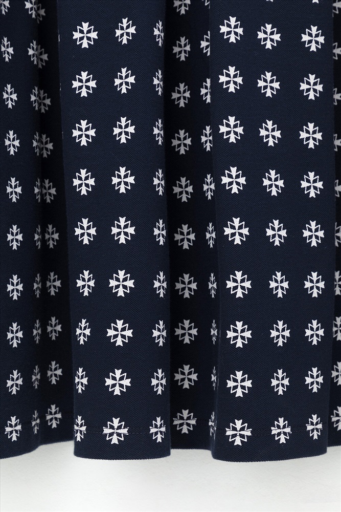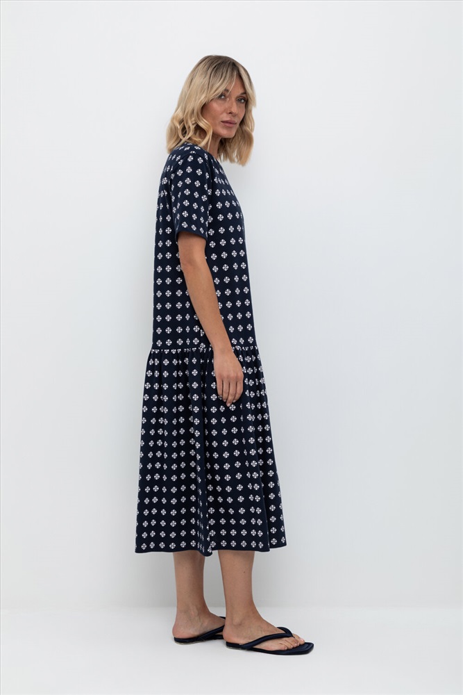 Трикотажное платье с воланом из набивного пике из длинноволокнистого гребенного хлопка. Спущенное плечо придает изделию свободный силуэт.