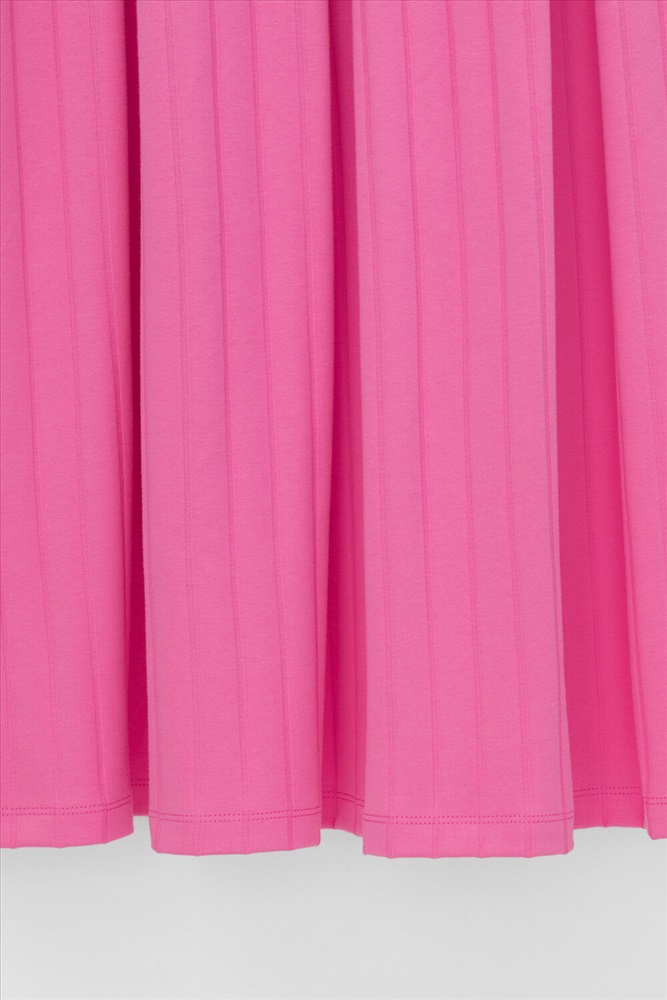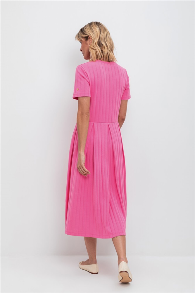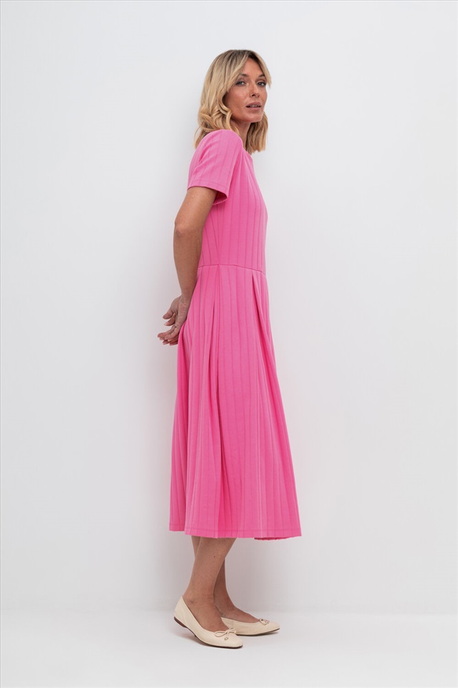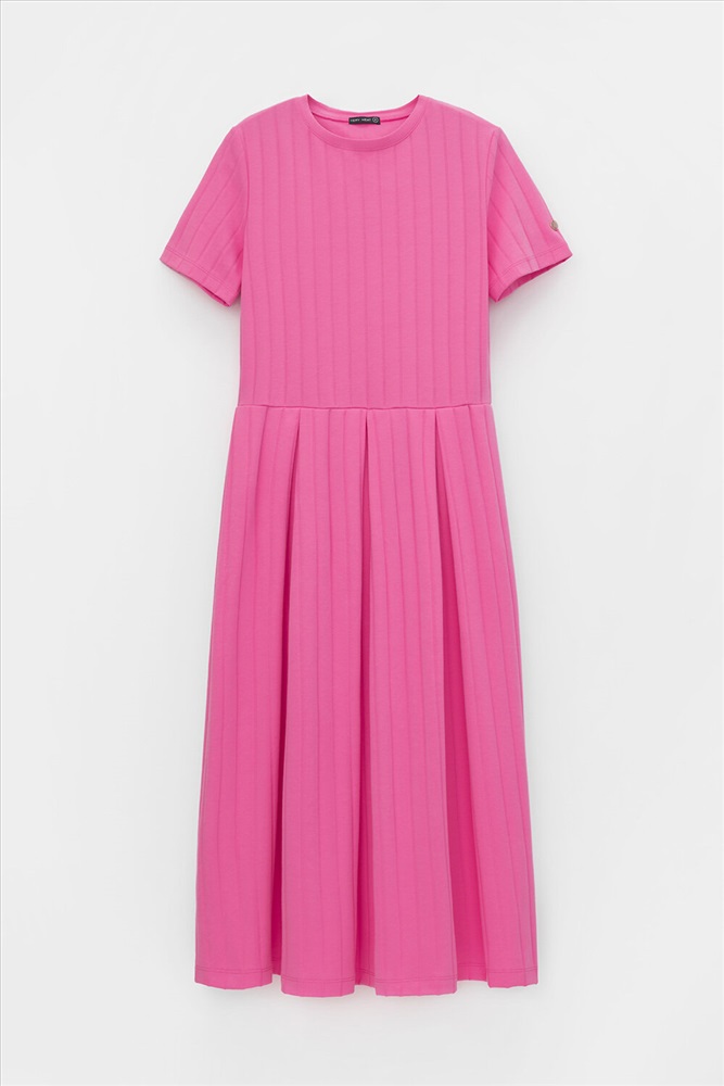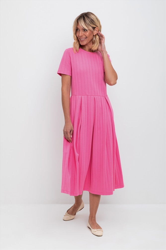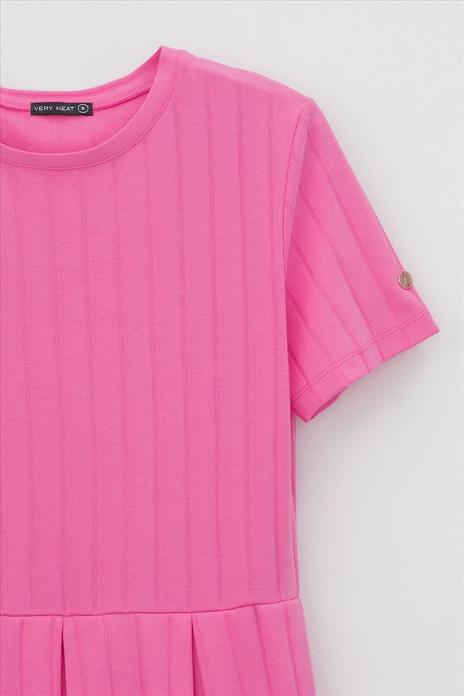 Платье в складку с круглым вырезом и короткими рукавами из плотного гладкого трикотажа интерлок в рубчик. Все трикотажные полотна производятся в соответствии с нормами Швейцарского сертификата ЭкоТекс. Сделано в России