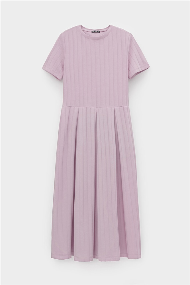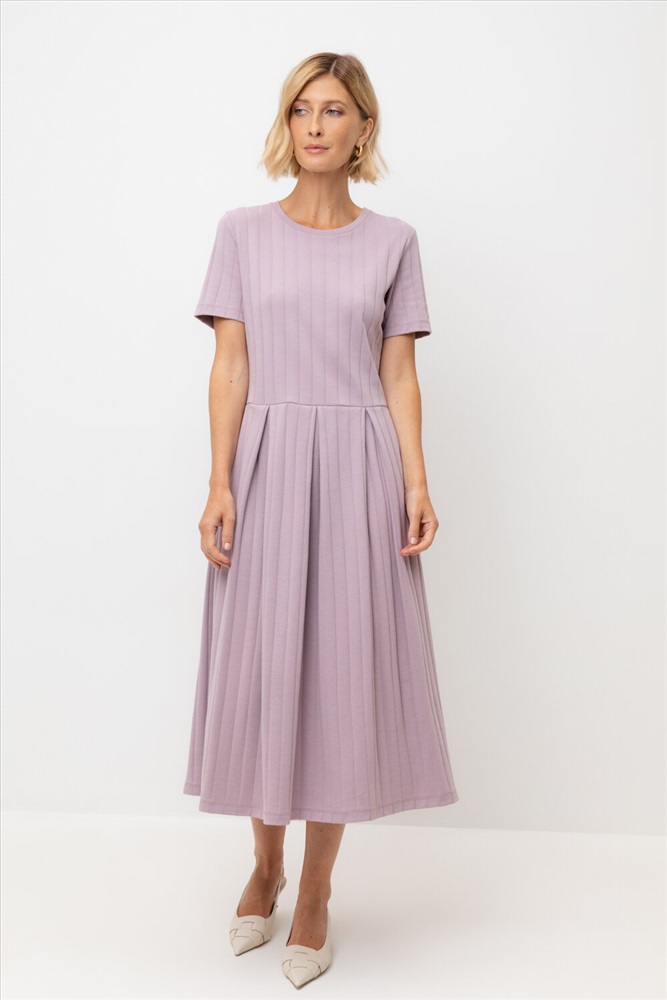 Платье с круглым вырезом и короткими рукавами из плотного гладкого трикотажа интерлок в рубчик. Все трикотажные полотна производятся в соответствии с нормами Швейцарского сертификата ЭкоТекс. Сделано в России